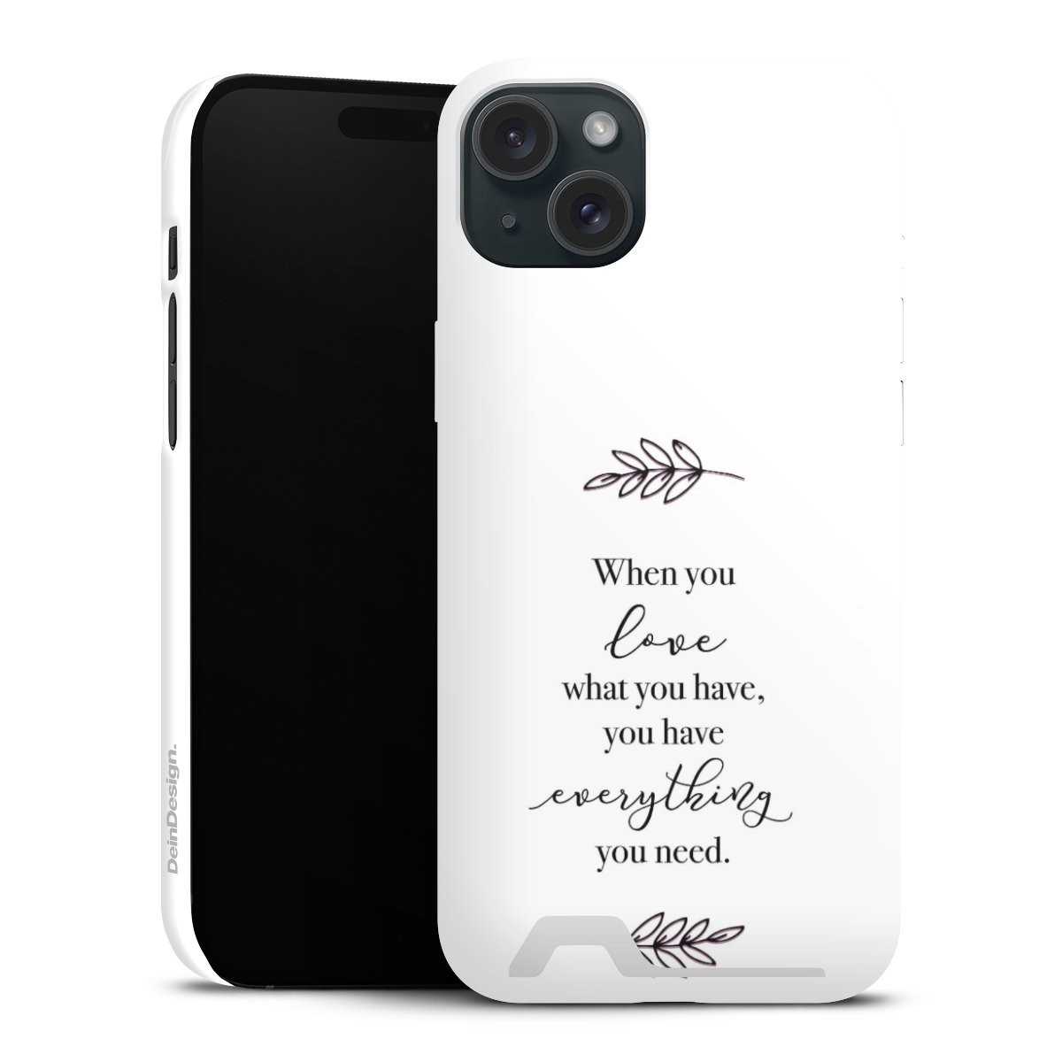 Entscheide Dich für einen Spruch, der zu 100% aussagt wofür Du einstehst. Zusätzlich kannst Du zu Deinem ausgewählten Spruch ein passendes Motiv kombinieren, sodass Dein Smartphone optisch was zu bieten hat. Doch nicht nur für das Aussehen sorgen wir, sondern auch zuverlässigen Schutz vor unschönen Alltagsgebrauchsspuren garantieren wir Dir. DeinDesign steht für innovative Drucktechnologie und hochwertige Materialien.