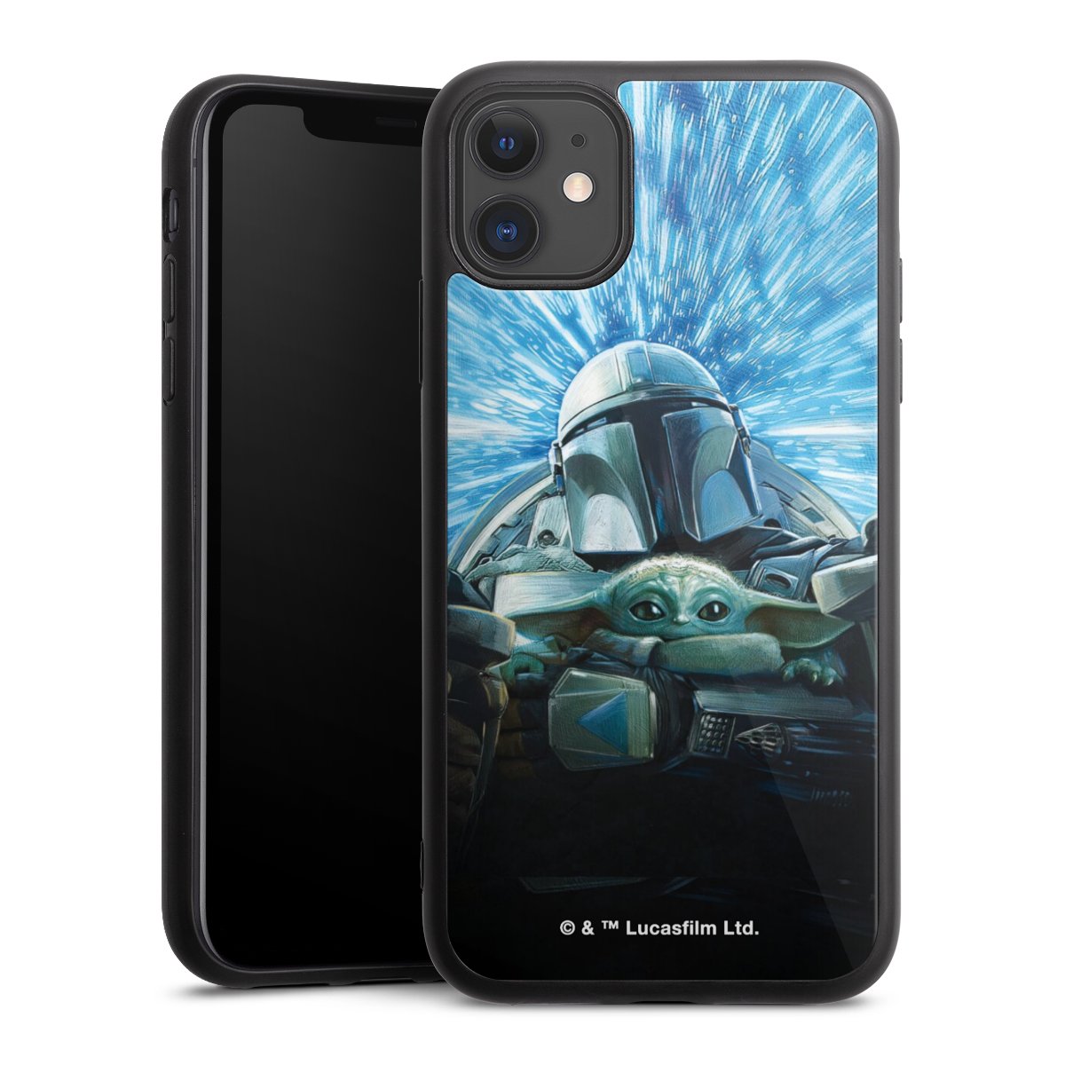 Grogu und Mando fliegen blau