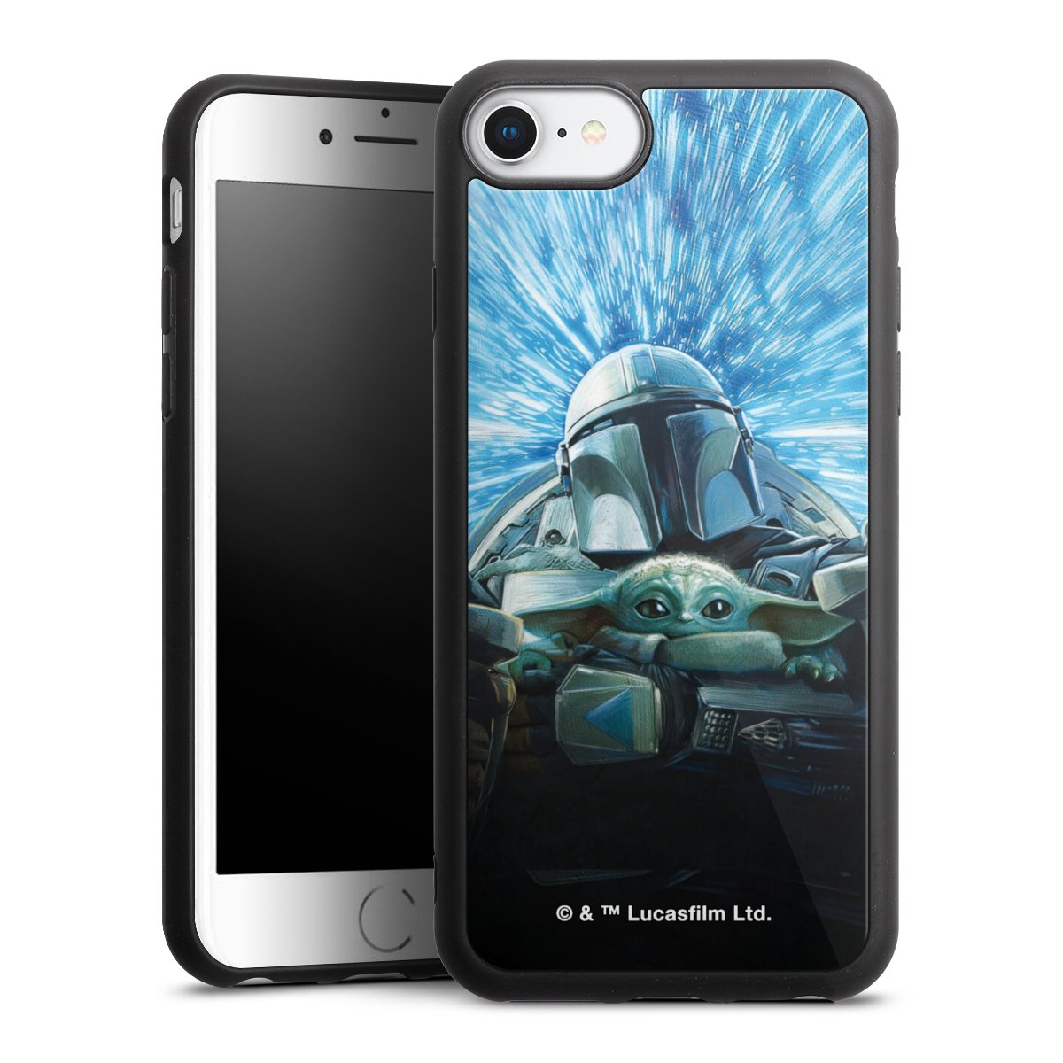 Grogu und Mando fliegen blau