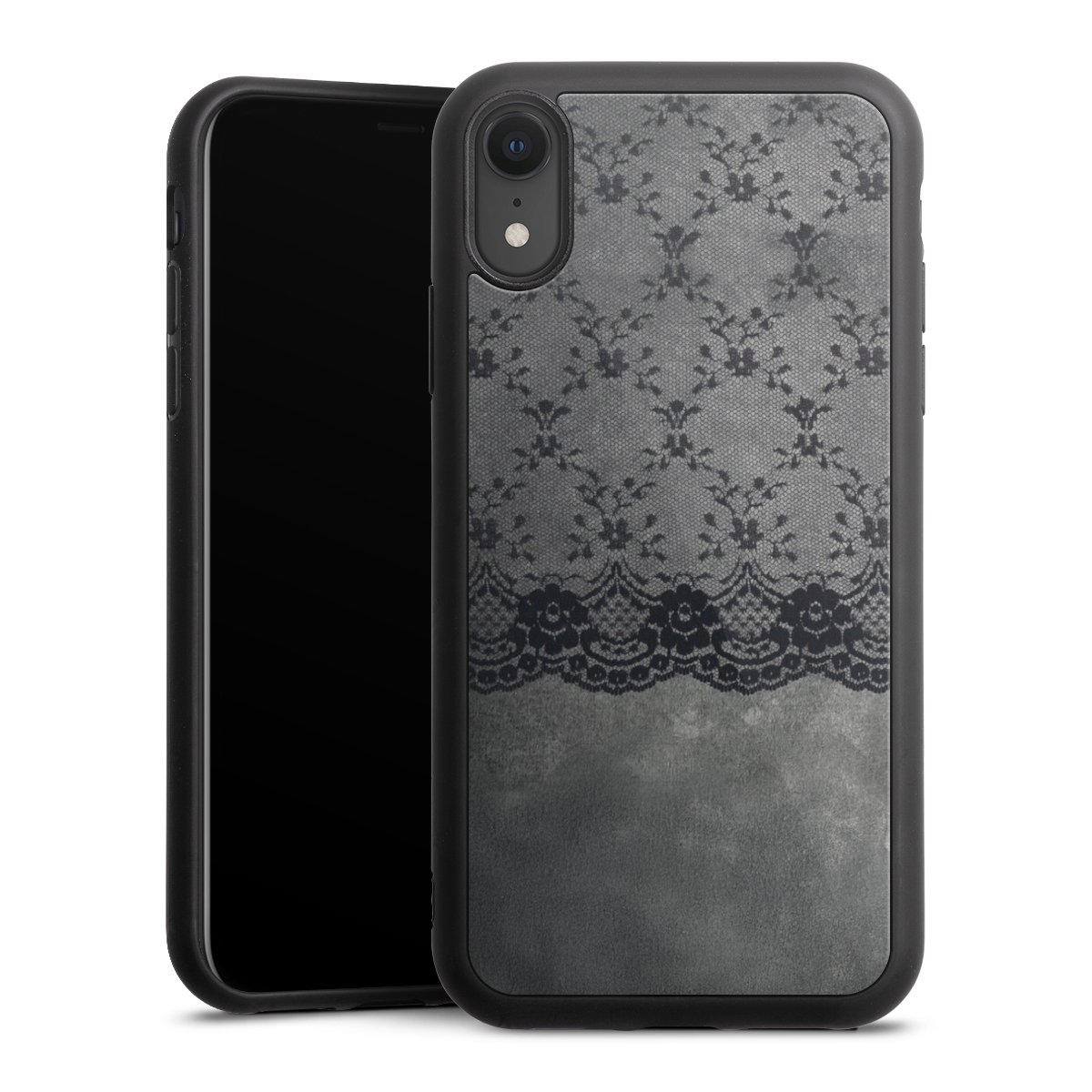 Schwarzes Spitzenmuster auf grauem Hintergrund