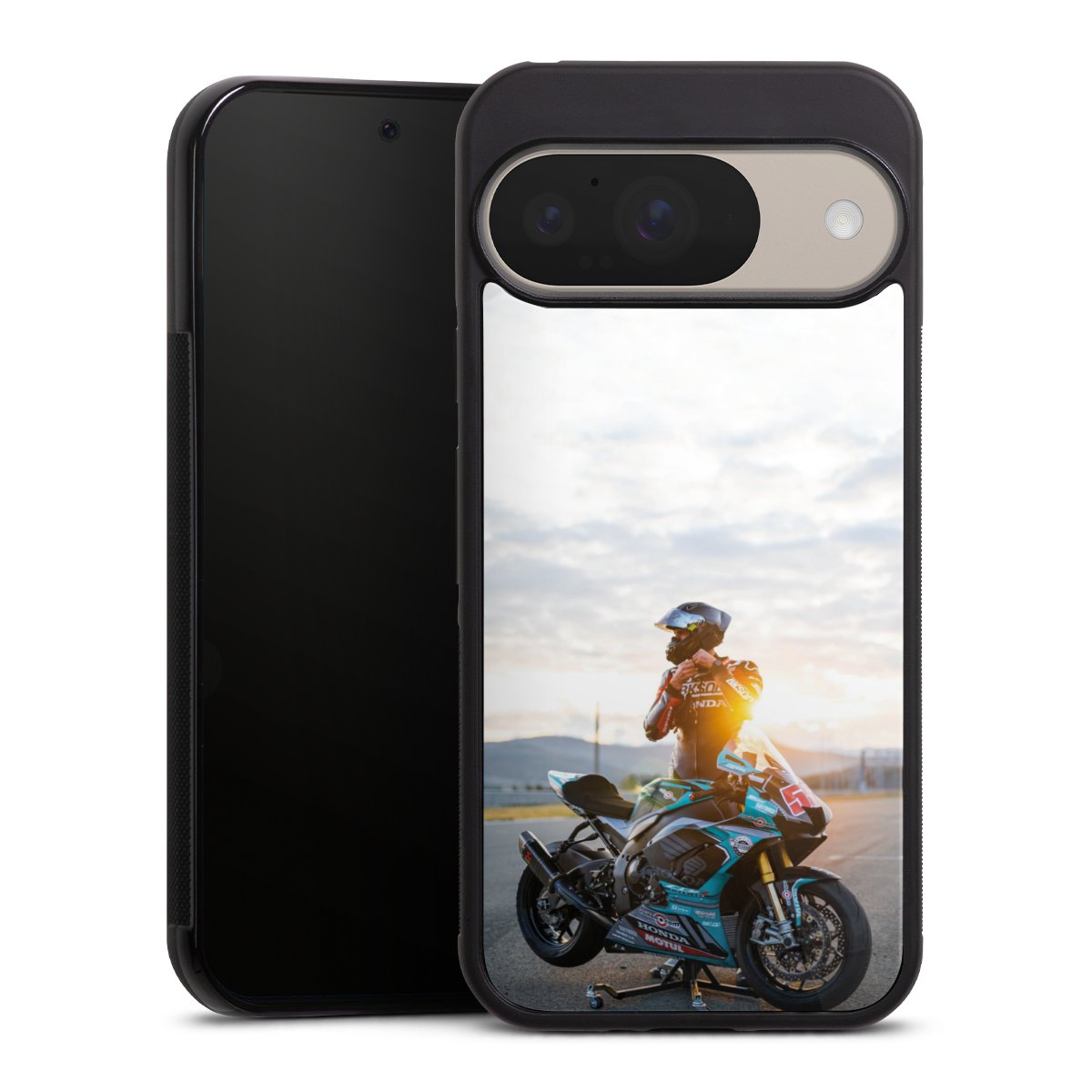 Wir drucken Dein Motiv auf die Rückseite des Glasinlays und verbinden es anschließend fest mit der Silikonhülle, sodass nichts übersteht und alles wie aus einem Guss wirkt. Außerdem ist das stabile Glaselement durch eine zusätzliche Beschichtung vor Kratzern geschützt und sorgt für eine leichte Reflexion auf dem brillanten Druckbild.