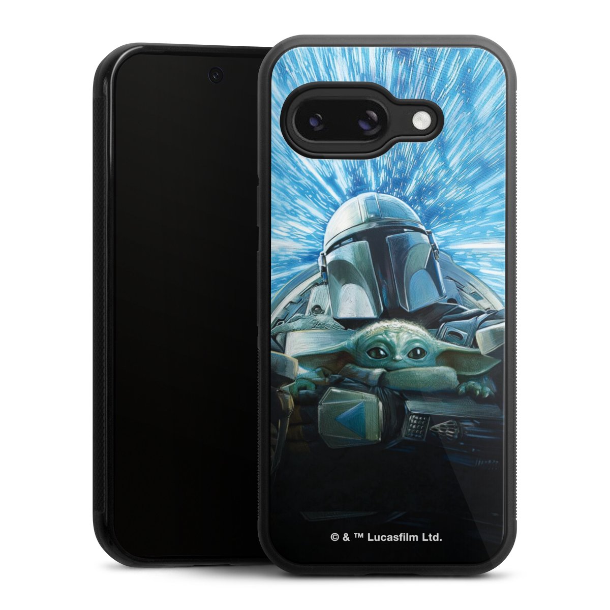Grogu und Mando fliegen blau