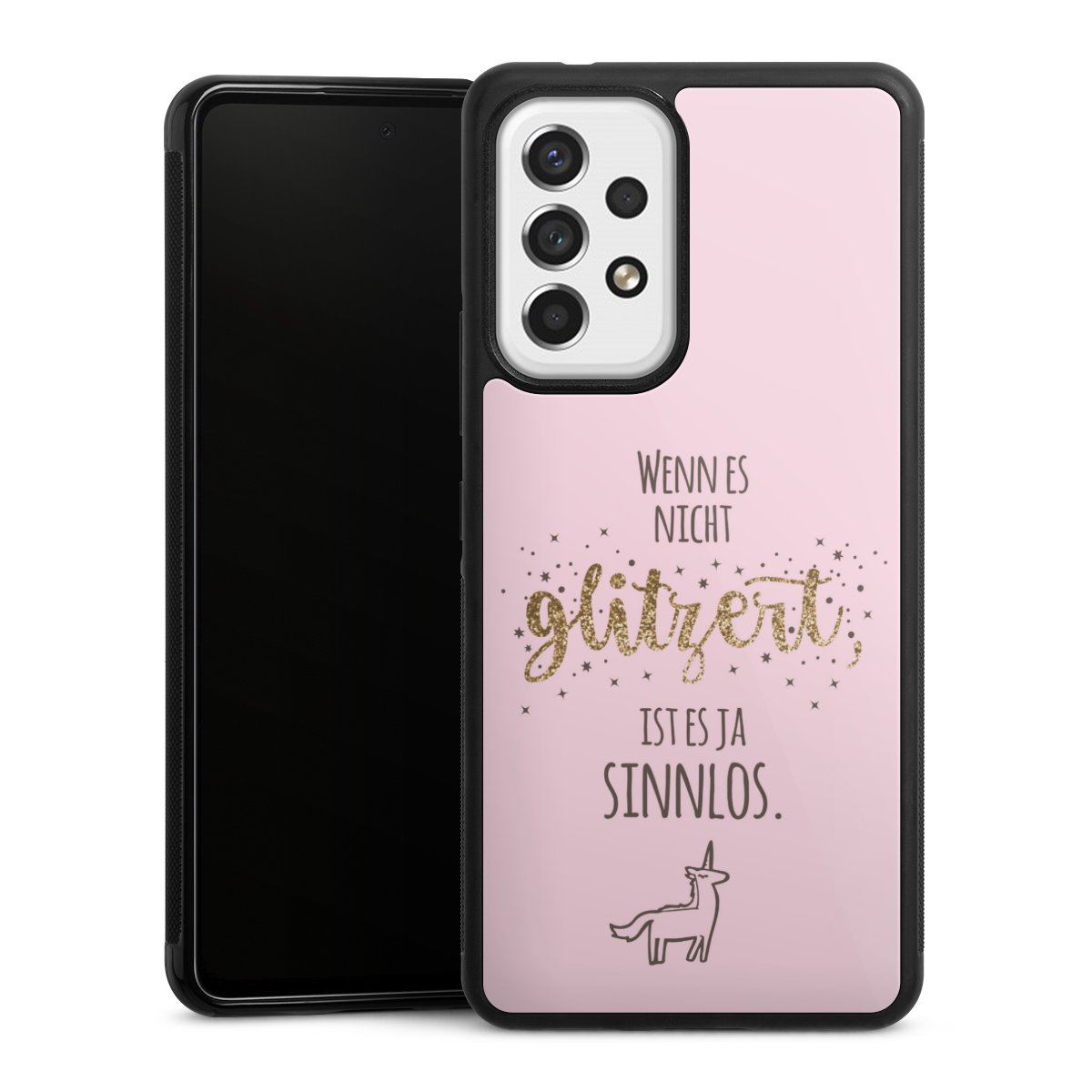 Wir drucken Dein Motiv auf die Rückseite des Glasinlays und verbinden es anschließend fest mit der Silikonhülle, sodass nichts übersteht und alles wie aus einem Guss wirkt. Außerdem ist das stabile Glaselement durch eine zusätzliche Beschichtung vor Kratzern geschützt und sorgt für eine leichte Reflexion auf dem brillanten Druckbild.