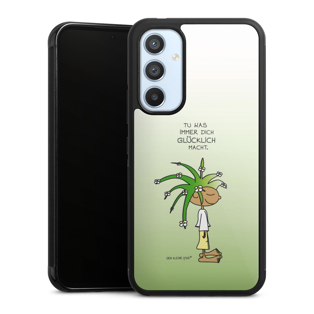 Wir drucken Dein Motiv auf die Rückseite des Glasinlays und verbinden es anschließend fest mit der Silikonhülle, sodass nichts übersteht und alles wie aus einem Guss wirkt. Außerdem ist das stabile Glaselement durch eine zusätzliche Beschichtung vor Kratzern geschützt und sorgt für eine leichte Reflexion auf dem brillanten Druckbild.