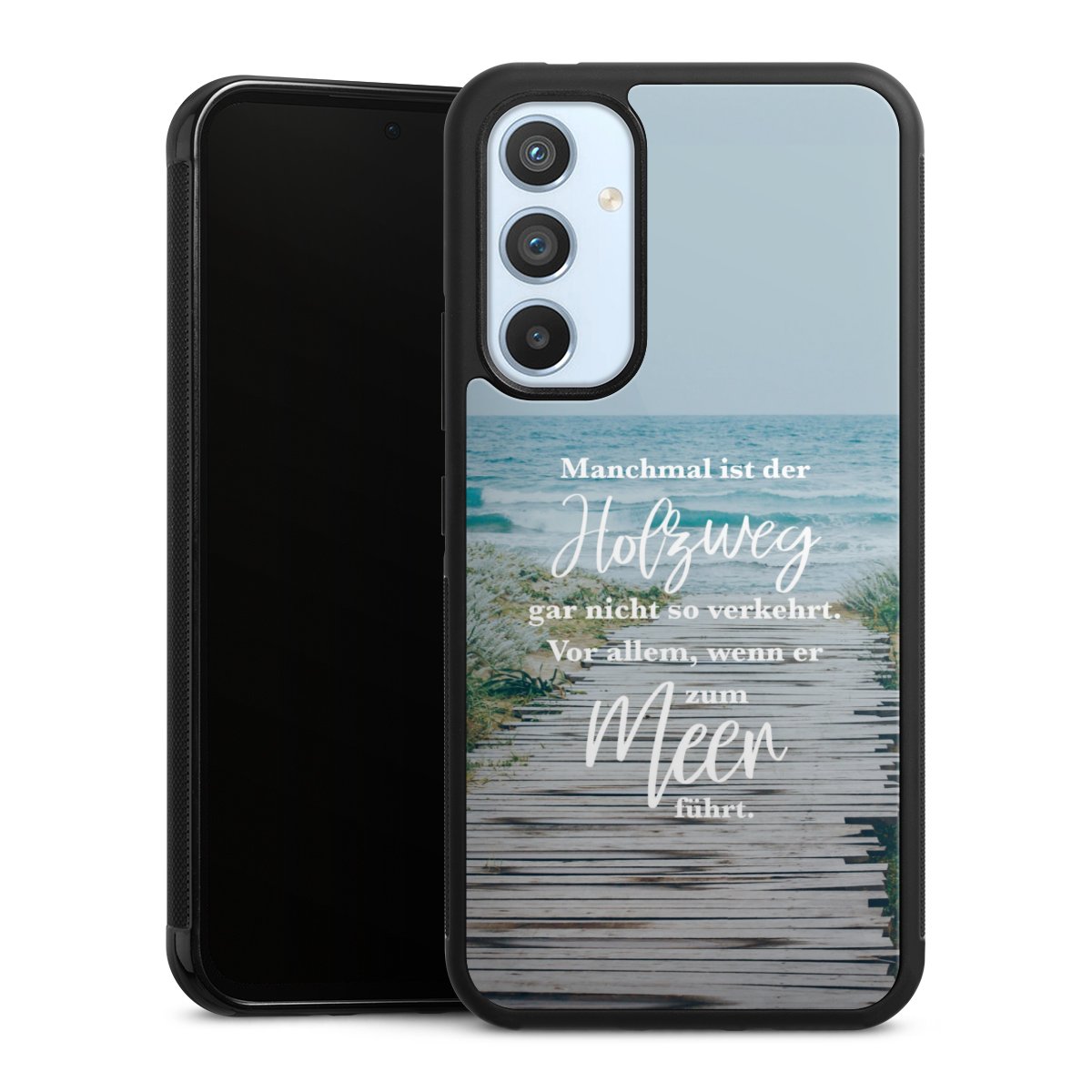 Wir drucken Dein Motiv auf die Rückseite des Glasinlays und verbinden es anschließend fest mit der Silikonhülle, sodass nichts übersteht und alles wie aus einem Guss wirkt. Außerdem ist das stabile Glaselement durch eine zusätzliche Beschichtung vor Kratzern geschützt und sorgt für eine leichte Reflexion auf dem brillanten Druckbild.