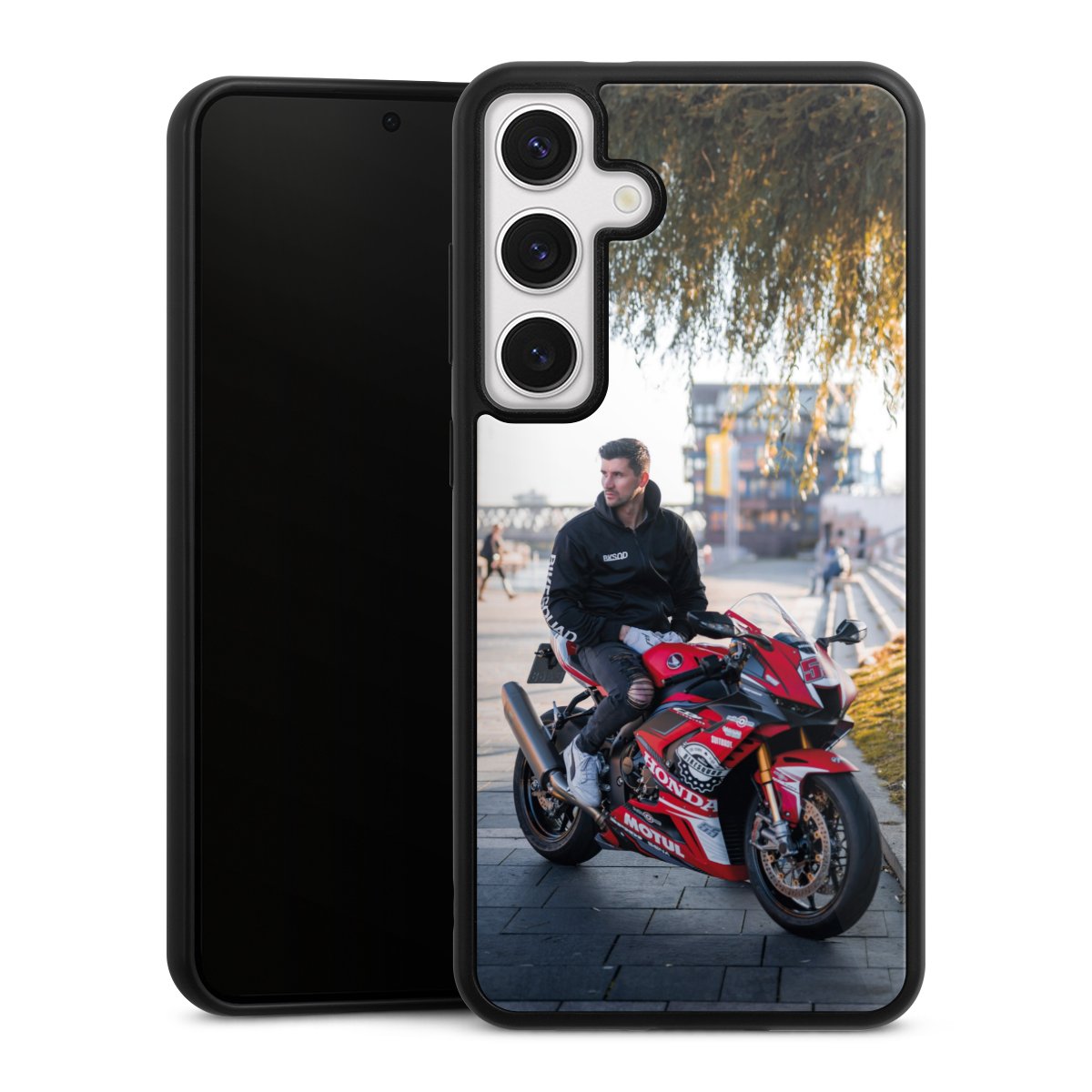 Wir drucken Dein Motiv auf die Rückseite des Glasinlays und verbinden es anschließend fest mit der Silikonhülle, sodass nichts übersteht und alles wie aus einem Guss wirkt. Außerdem ist das stabile Glaselement durch eine zusätzliche Beschichtung vor Kratzern geschützt und sorgt für eine leichte Reflexion auf dem brillanten Druckbild.