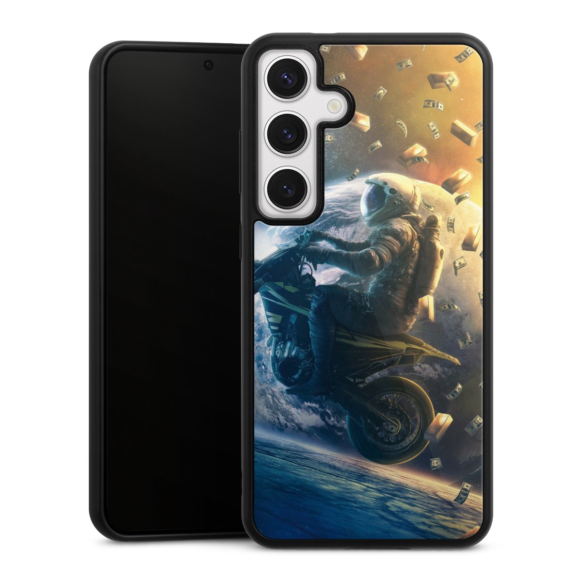 Wir drucken Dein Motiv auf die Rückseite des Glasinlays und verbinden es anschließend fest mit der Silikonhülle, sodass nichts übersteht und alles wie aus einem Guss wirkt. Außerdem ist das stabile Glaselement durch eine zusätzliche Beschichtung vor Kratzern geschützt und sorgt für eine leichte Reflexion auf dem brillanten Druckbild.