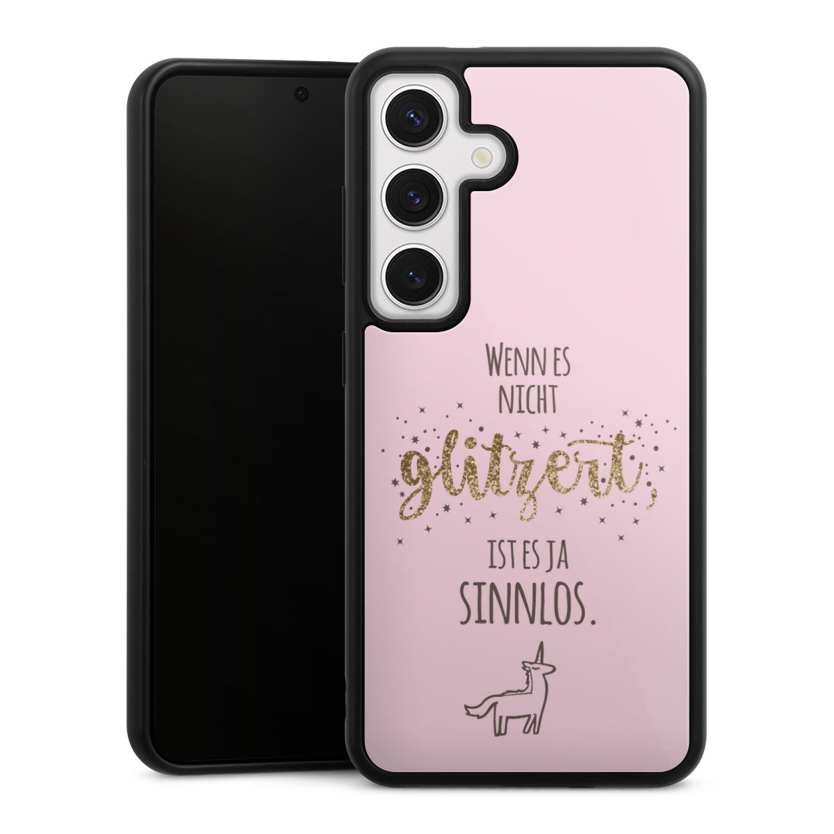 Wir drucken Dein Motiv auf die Rückseite des Glasinlays und verbinden es anschließend fest mit der Silikonhülle, sodass nichts übersteht und alles wie aus einem Guss wirkt. Außerdem ist das stabile Glaselement durch eine zusätzliche Beschichtung vor Kratzern geschützt und sorgt für eine leichte Reflexion auf dem brillanten Druckbild.
