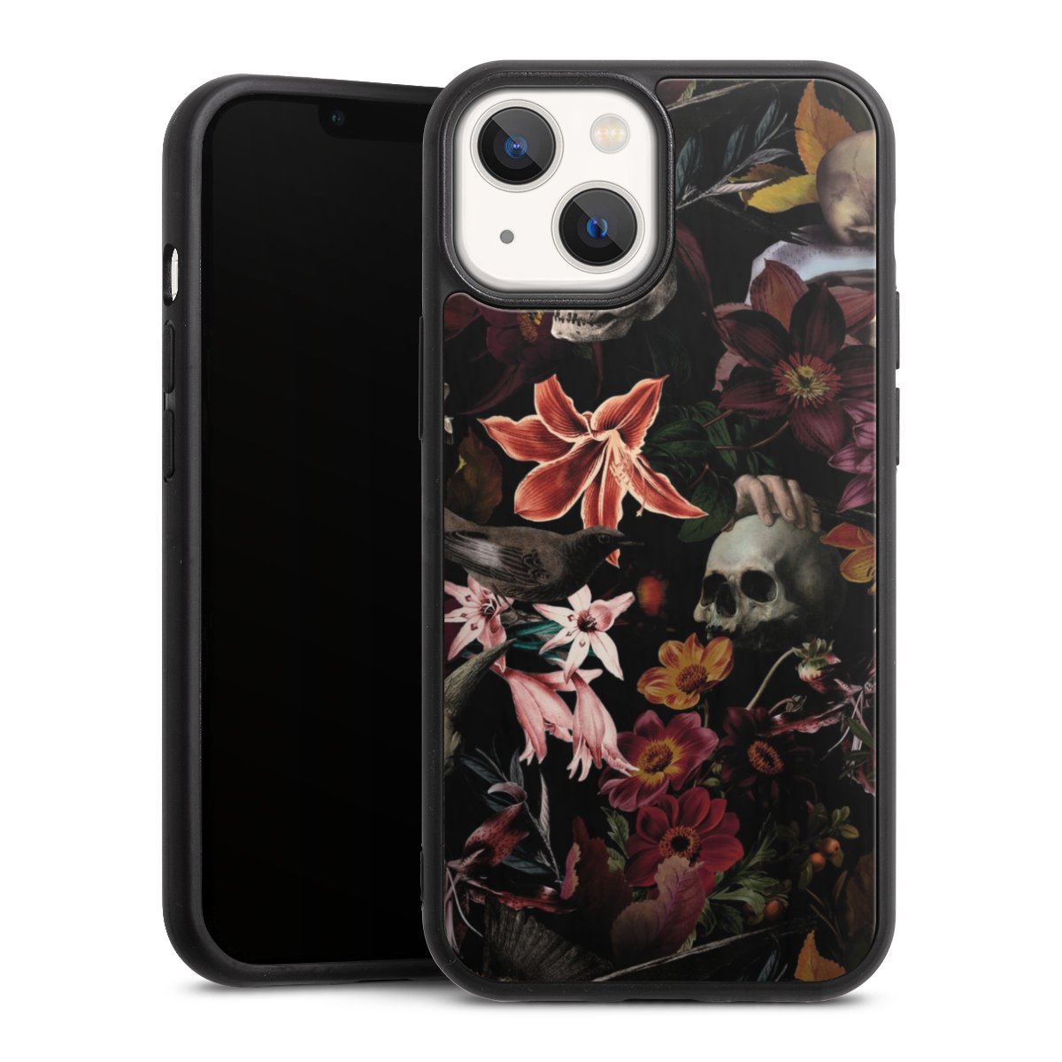 Totenköpfe und Blumen auf dunklem Hintergrund