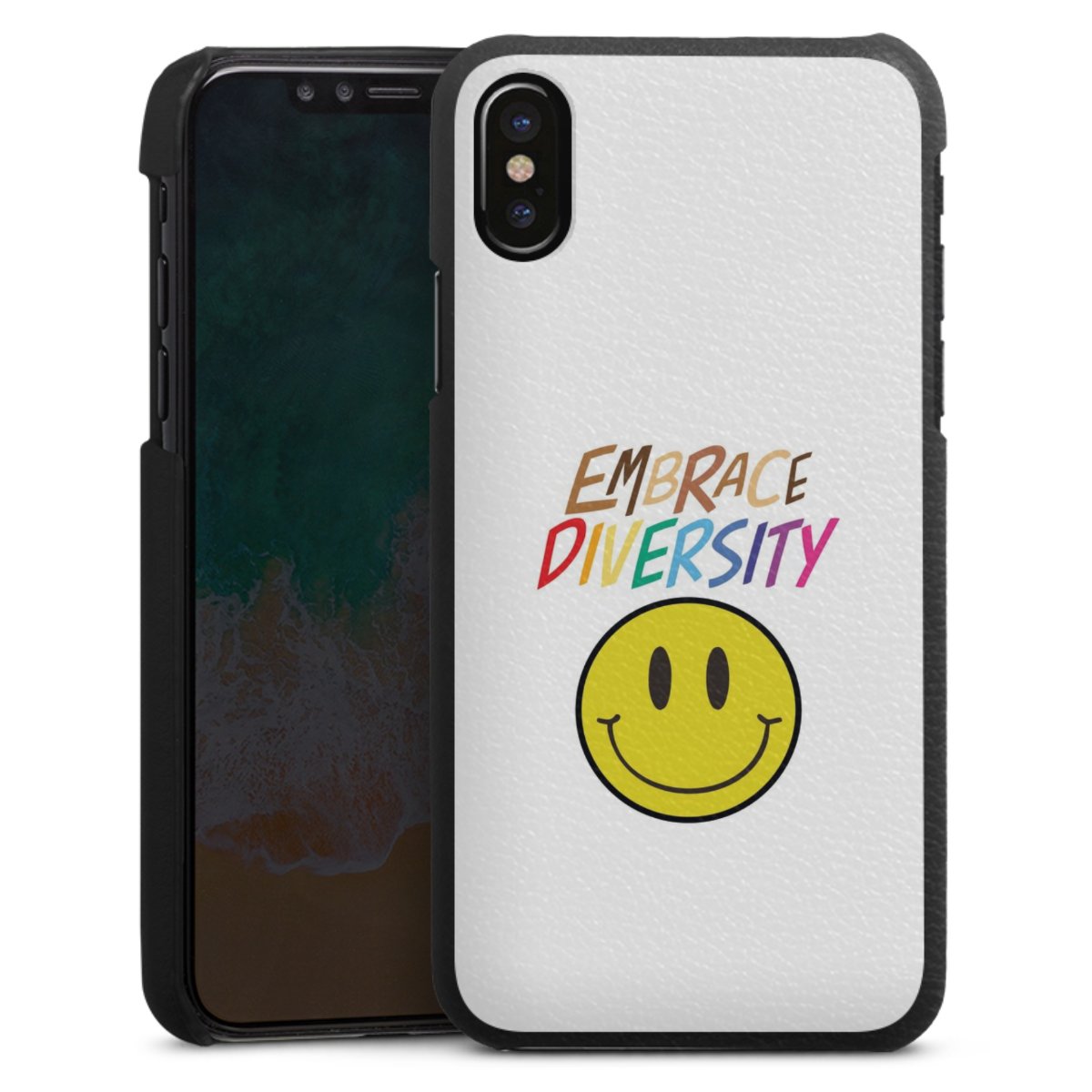 Die handgefertigte Handyhülle besteht außen aus hochwertigen Echtleder-Fasern, die Innenseite besteht aus stabilem Polycarbonat mit einer edlen Softtouch Beschichtung. Durch die Lederstruktur auf der Außenseite liegt das zeitlose Modell griffig in der Hand. Die Handyhülle ist in den Farben Schwarz, Weiß und Braun erhältlich.