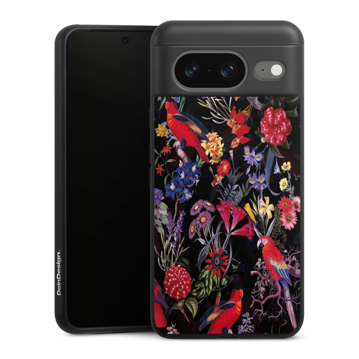 Dunkle Blumen und Papageien