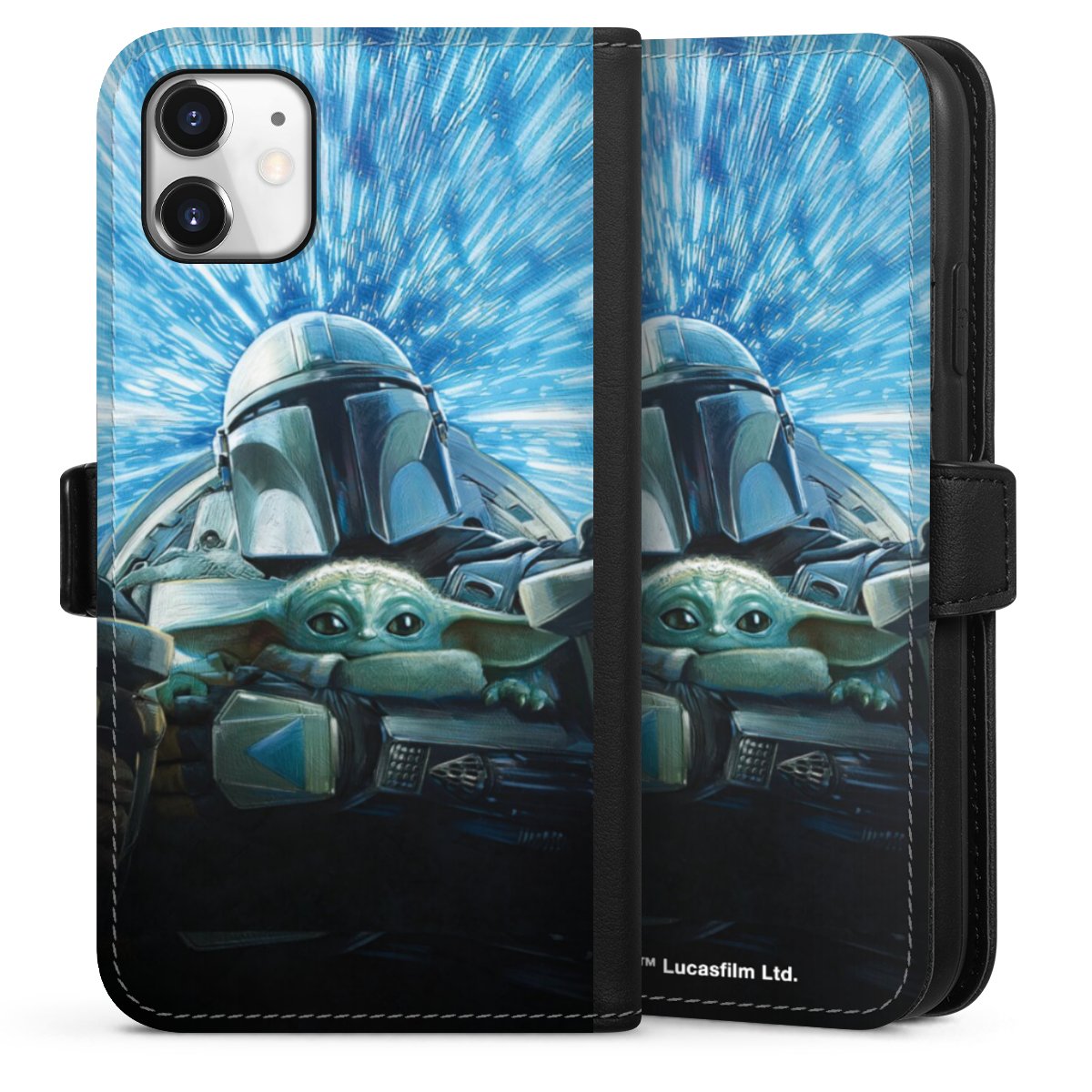Grogu und Mando fliegen blau