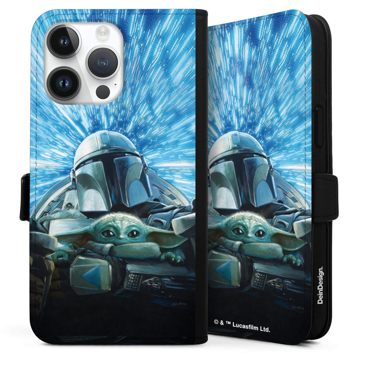 Grogu und Mando fliegen blau