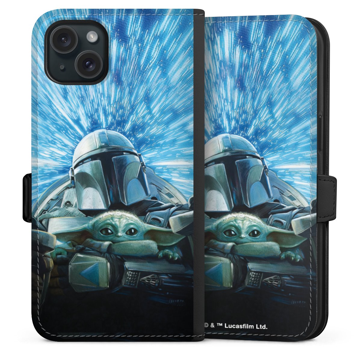Grogu und Mando fliegen blau