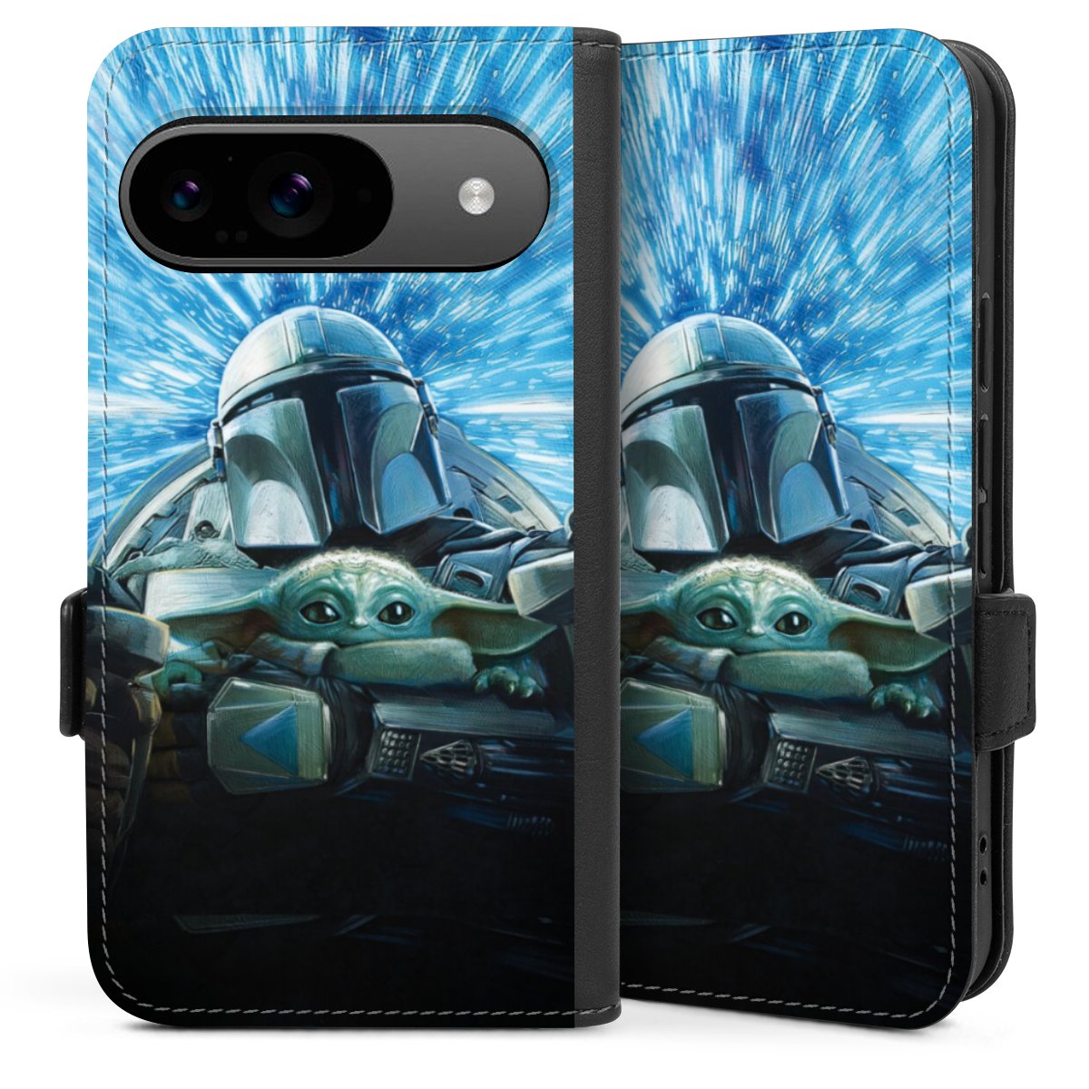 Grogu und Mando fliegen blau