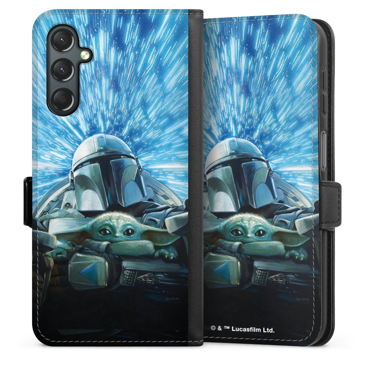Grogu und Mando fliegen blau