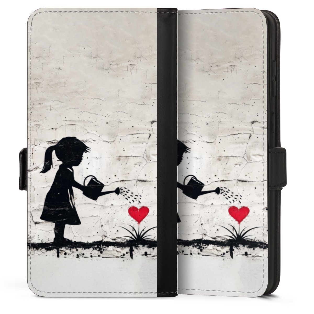 Bei dieser Handyhülle nutzen wir das solide Direktdruck-Verfahren. Der Druckbereich umfasst die Vorder- und Rückseite, die Innenseiten bleiben unbedruckt. Die Handyhülle kann sowohl unbedruckt, als auch vollflächig oder partiell bedruckt bestellt werden. Beachte hierbei, dass der Druck wie in der Ansicht dargestellt auf dem Rücken unterbrochen ist, damit Dein Druckbild durch das Klappen der Tasche nicht brüchig wird. Der Vorteil bei diesem Produkt: aufgrund der seitlich angebrachten Lasche wird kein Teil des Druckbildes verdeckt.