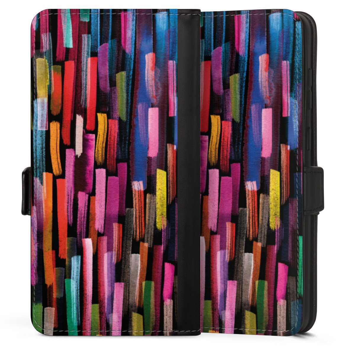 Bei dieser Handyhülle nutzen wir das solide Direktdruck-Verfahren. Der Druckbereich umfasst die Vorder- und Rückseite, die Innenseiten bleiben unbedruckt. Die Handyhülle kann sowohl unbedruckt, als auch vollflächig oder partiell bedruckt bestellt werden. Beachte hierbei, dass der Druck wie in der Ansicht dargestellt auf dem Rücken unterbrochen ist, damit Dein Druckbild durch das Klappen der Tasche nicht brüchig wird. Der Vorteil bei diesem Produkt: aufgrund der seitlich angebrachten Lasche wird kein Teil des Druckbildes verdeckt.