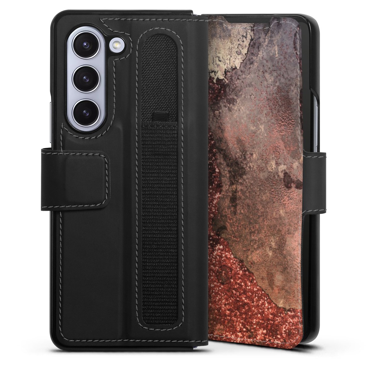 Bei dieser Handyhülle nutzen wir das solide Direktdruck-Verfahren. Der Druckbereich umfasst die Vorder- und Rückseite, die Innenseiten bleiben unbedruckt. Die Handyhülle kann sowohl unbedruckt, als auch vollflächig oder partiell bedruckt bestellt werden. Beachte hierbei, dass der Druck wie in der Ansicht dargestellt auf dem Rücken unterbrochen ist, damit Dein Druckbild durch das Klappen der Tasche nicht brüchig wird. Der Vorteil bei diesem Produkt: aufgrund der seitlich angebrachten Lasche wird kein Teil des Druckbildes verdeckt.