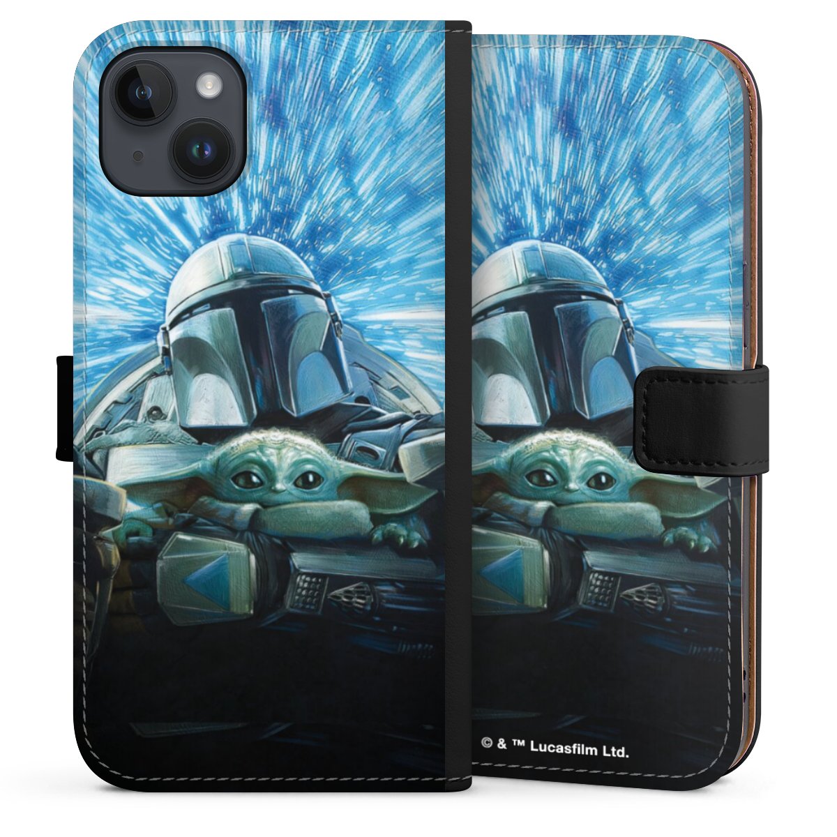 Grogu und Mando fliegen blau