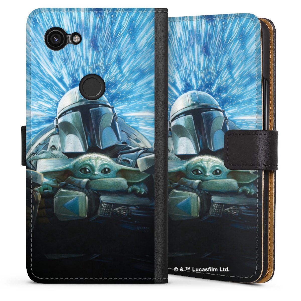Grogu und Mando fliegen blau