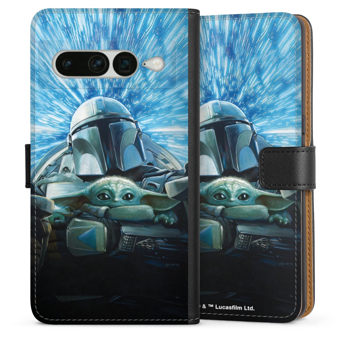 Grogu und Mando fliegen blau
