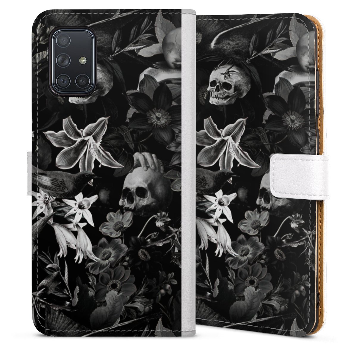 Totenköpfe und Blumen auf schwarzem Hintergrund