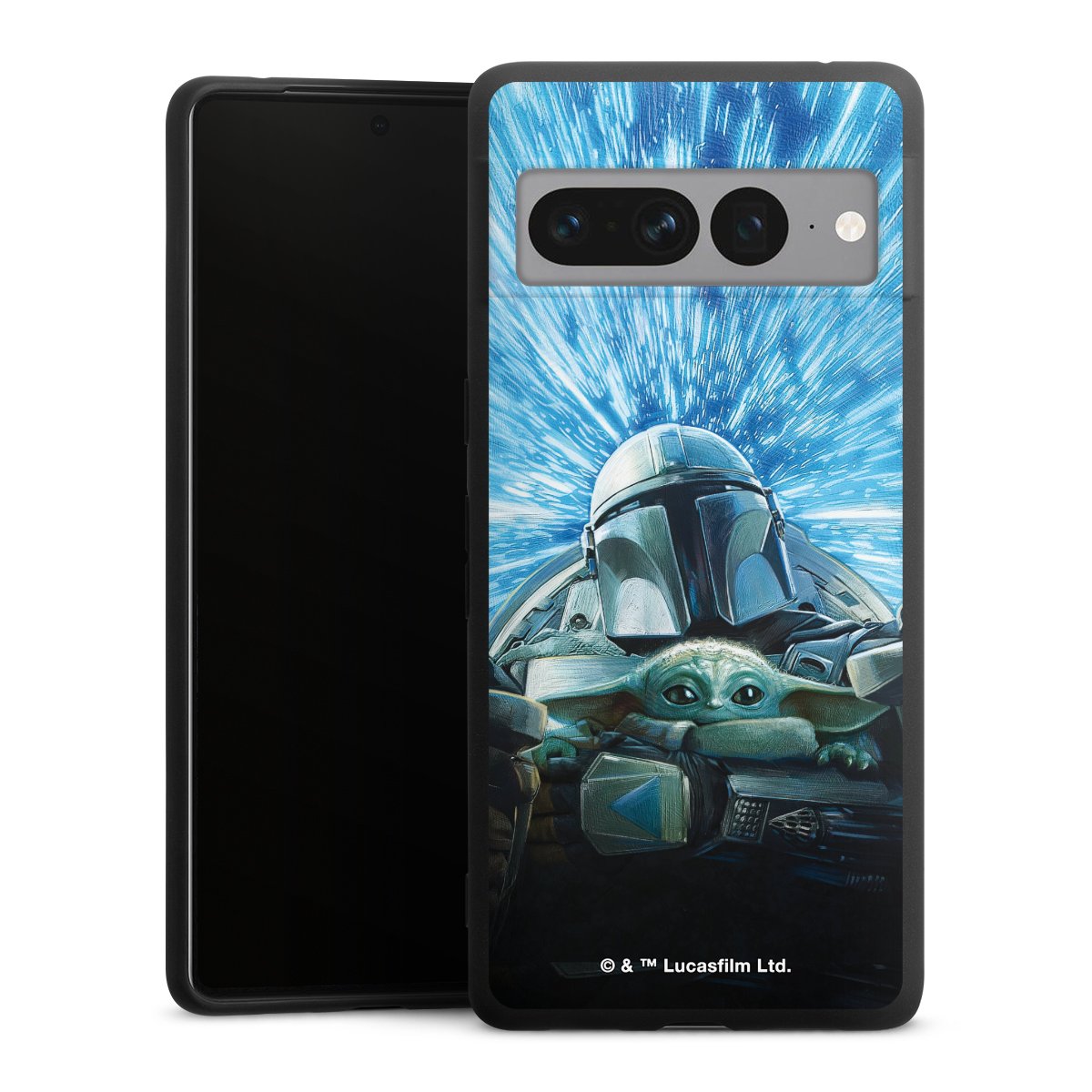 Grogu und Mando fliegen blau