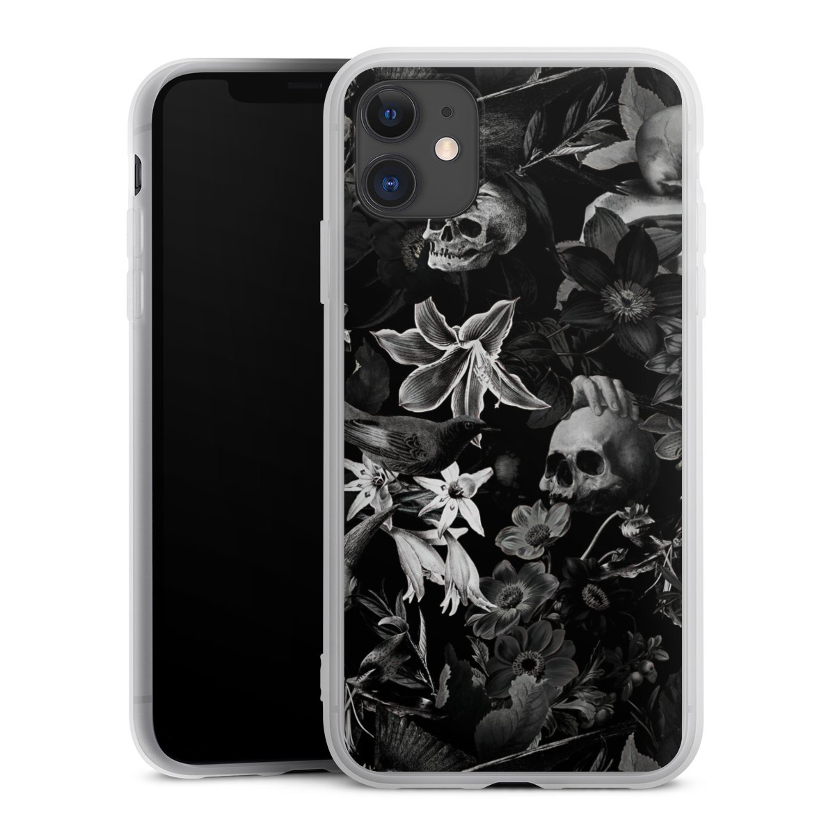 Totenköpfe und Blumen auf schwarzem Hintergrund