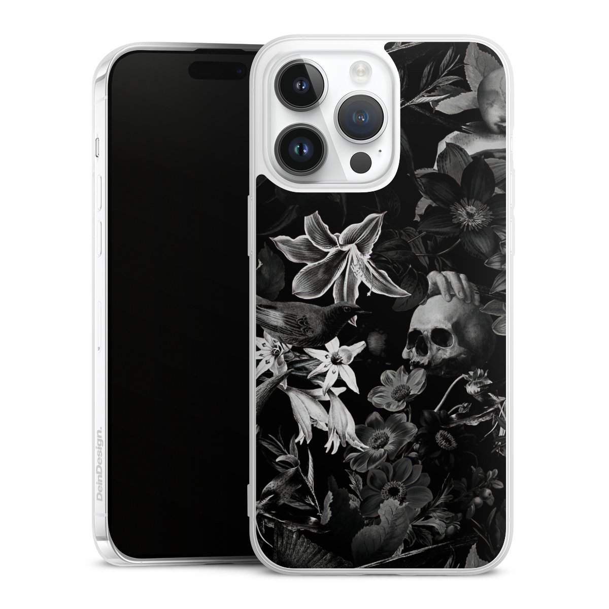 Totenköpfe und Blumen auf schwarzem Hintergrund