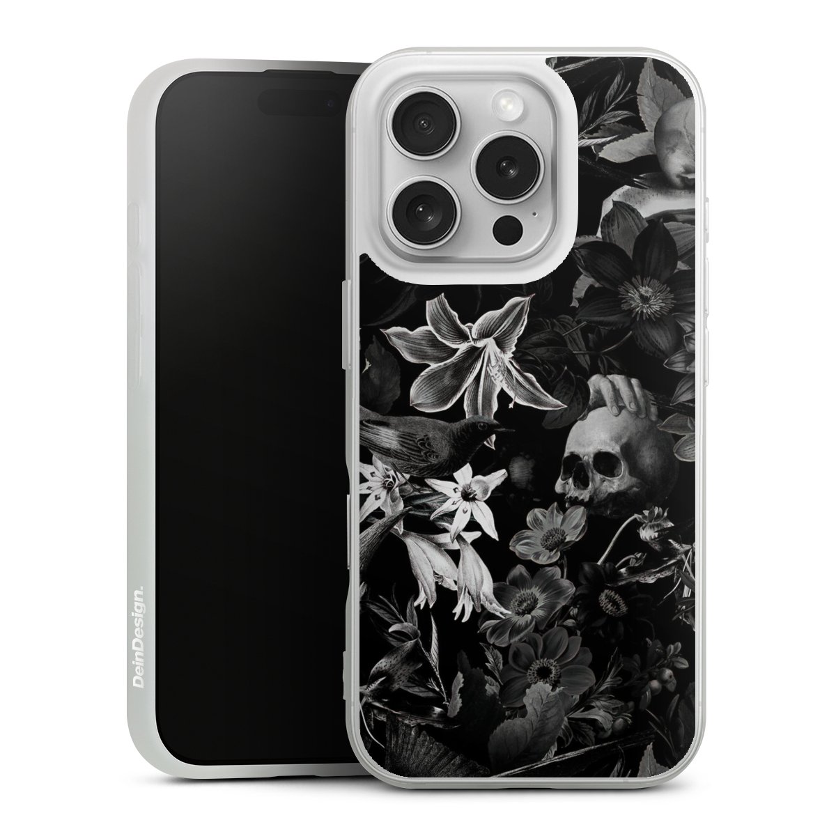 Totenköpfe und Blumen auf schwarzem Hintergrund