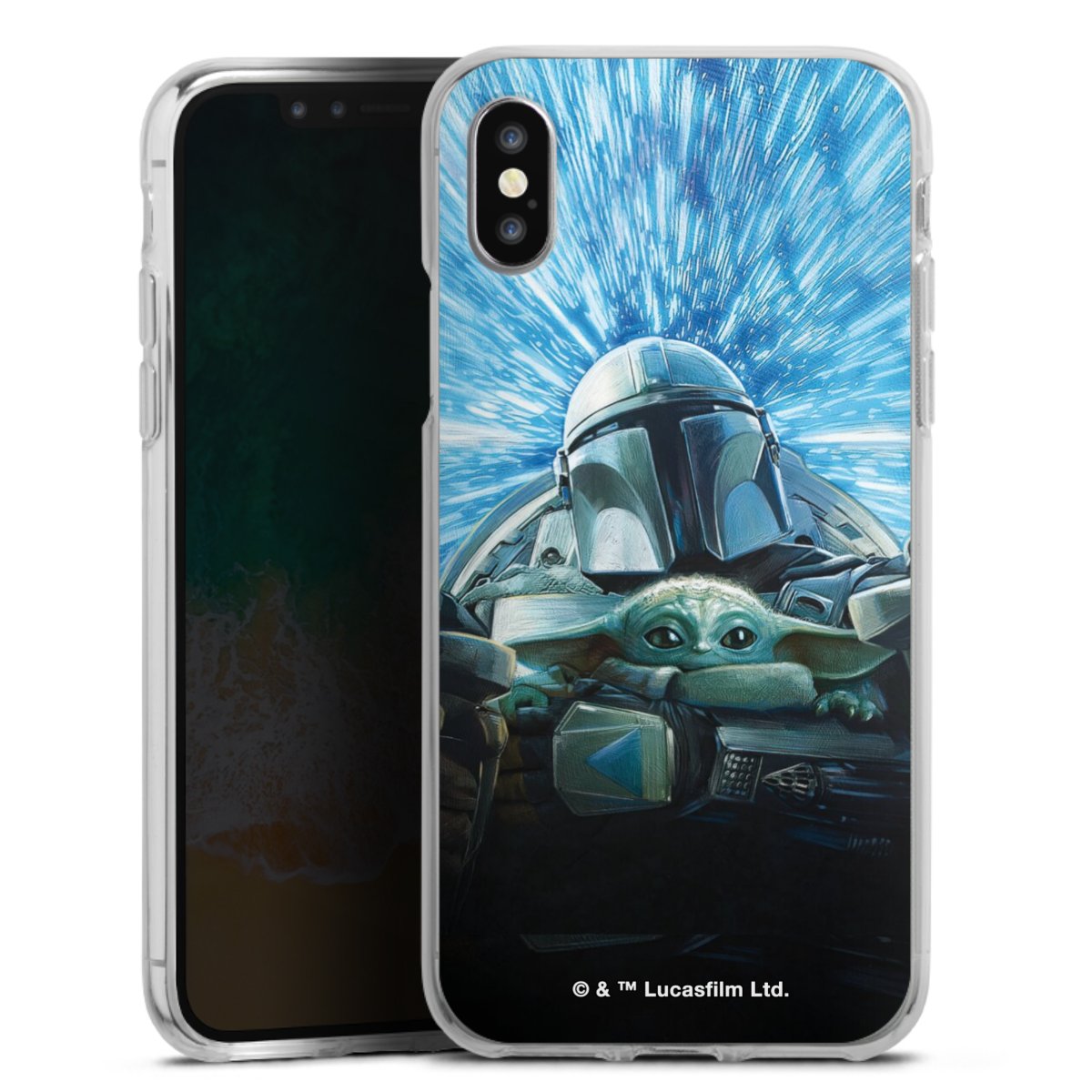 Grogu und Mando fliegen blau