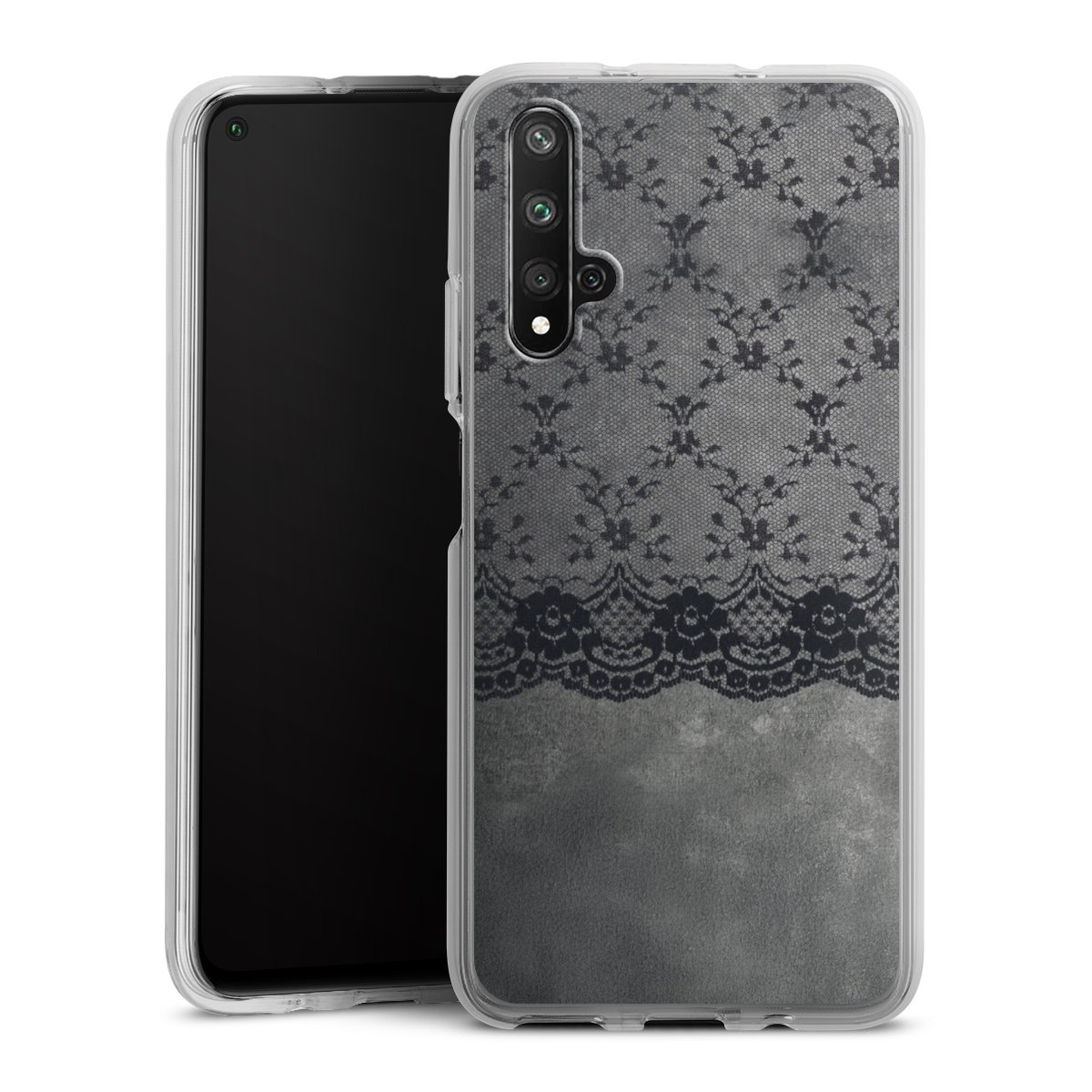 Schwarzes Spitzenmuster auf grauem Hintergrund