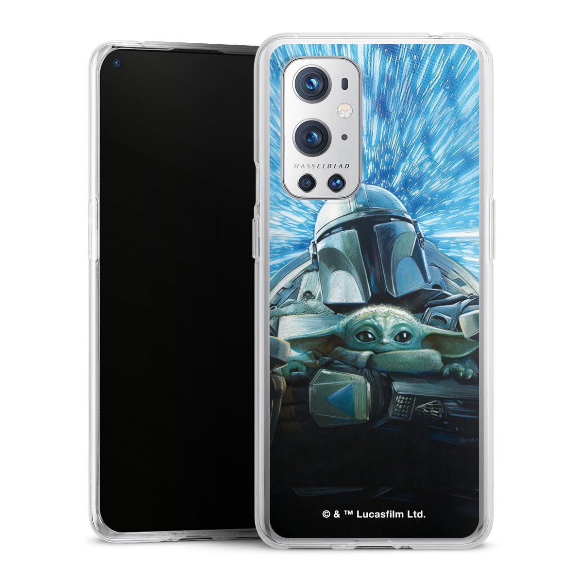 Grogu und Mando fliegen blau