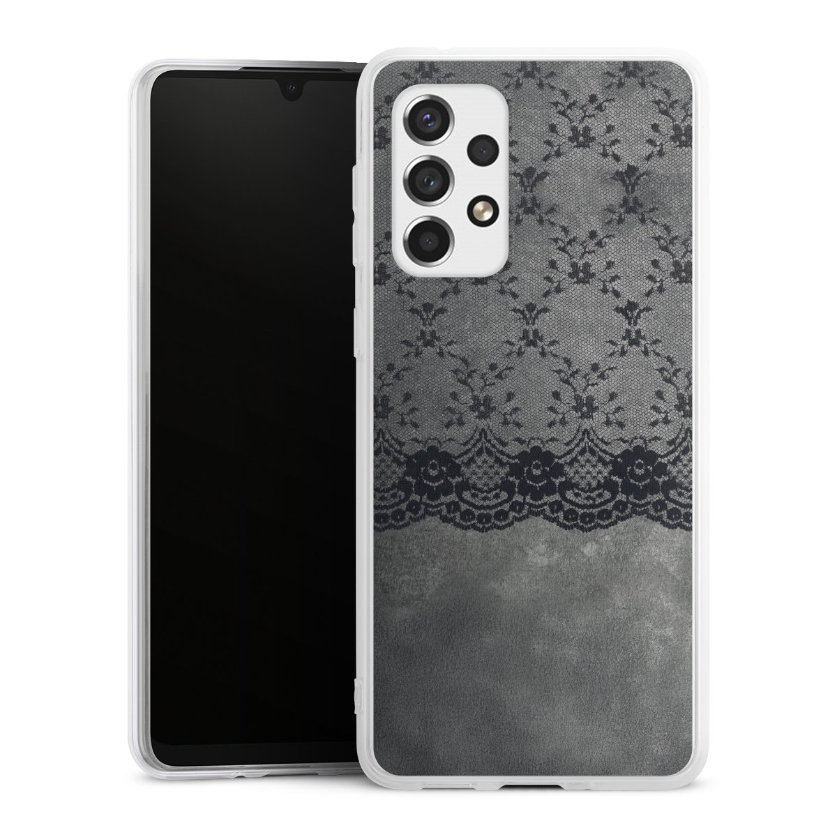 Schwarzes Spitzenmuster auf grauem Hintergrund