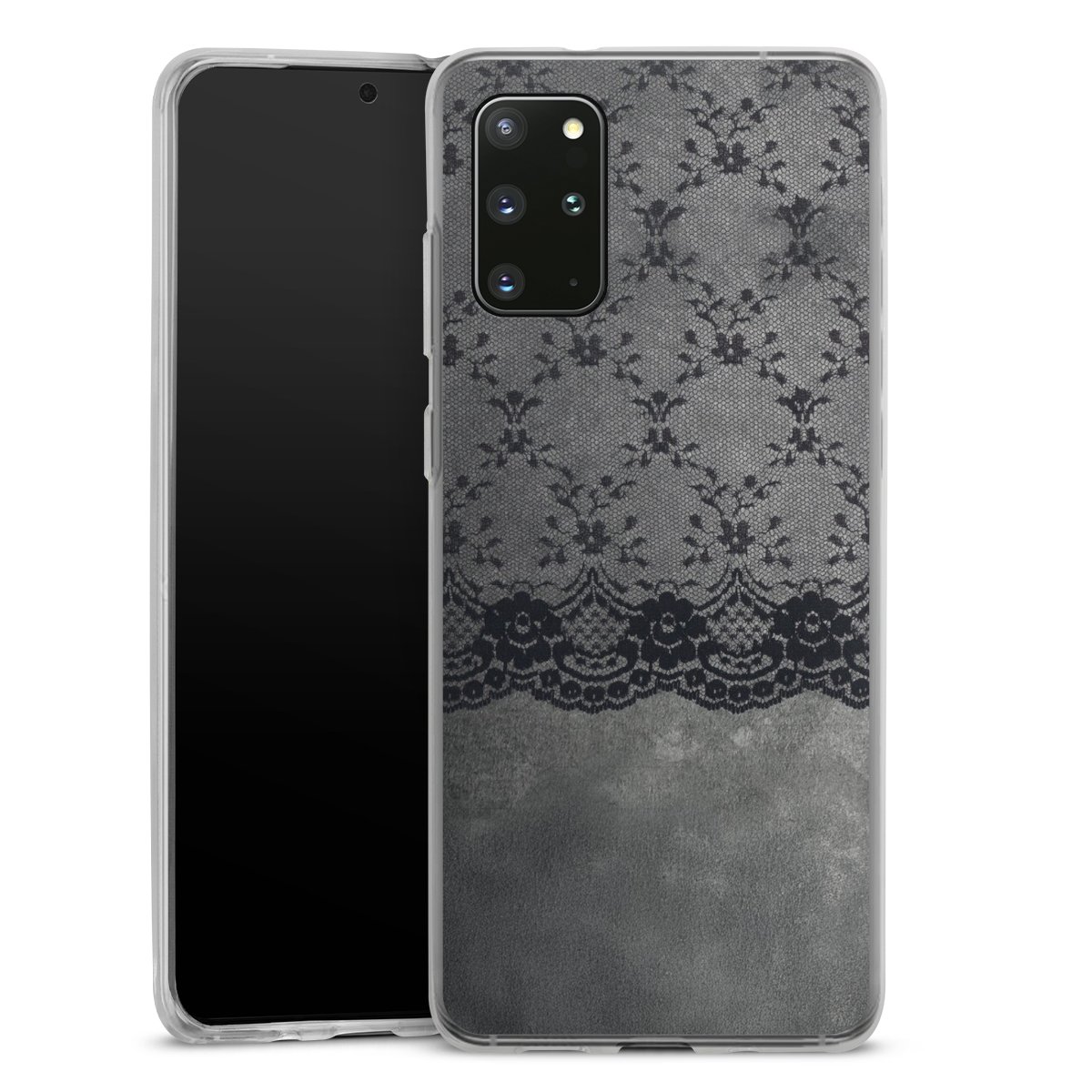 Schwarzes Spitzenmuster auf grauem Hintergrund