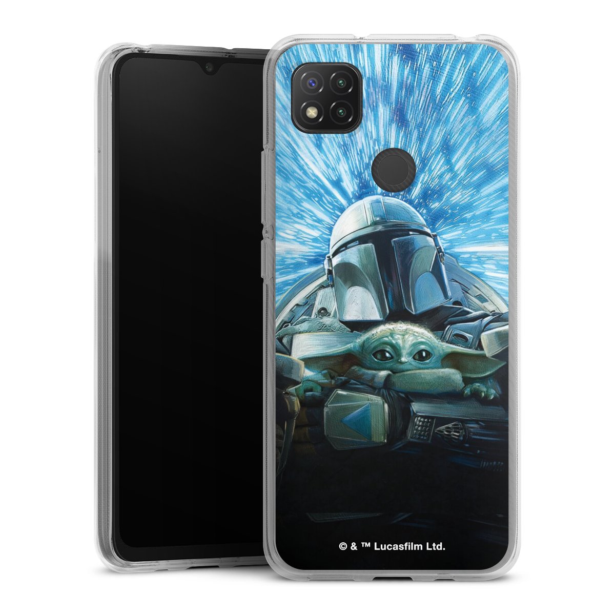 Grogu und Mando fliegen blau