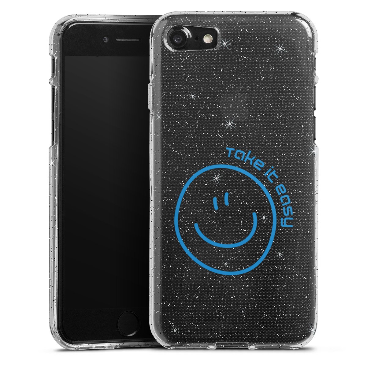 Die flexible Silikonhülle besteht aus robustem TPU (thermoplastisches Polyurethan) mit eingearbeiteten Glitzerpartikeln. Durch das langlebige, bruchsichere Material ist die Hülle biegsam und formbeständig zugleich. Die funkelnde Variante unter unseren Handyhüllen liegt griffig in der Hand und ist in Transparent mit silbernem Glitzer erhältlich.