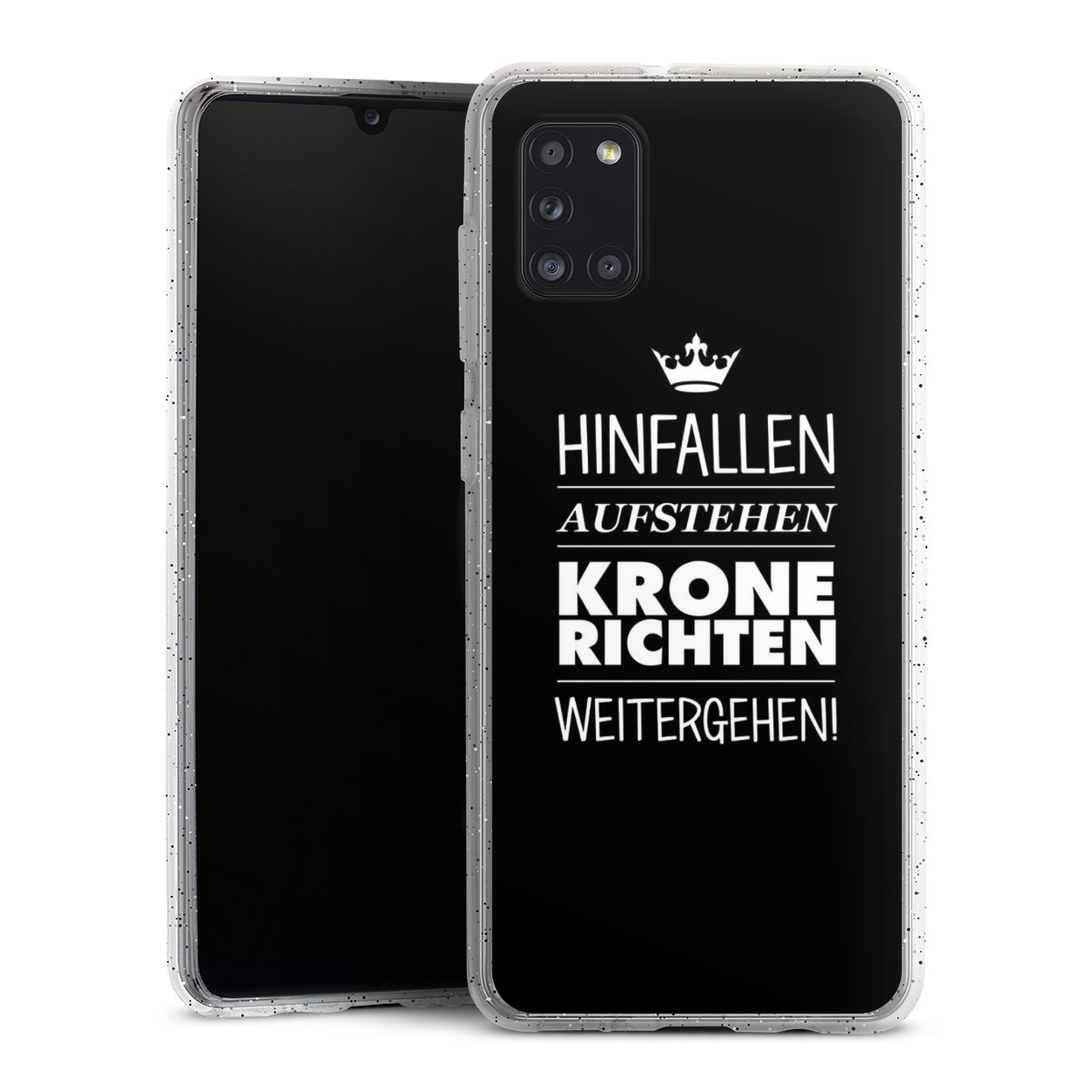 Die flexible Silikonhülle besteht aus robustem TPU (thermoplastisches Polyurethan) mit eingearbeiteten Glitzerpartikeln. Durch das langlebige, bruchsichere Material ist die Hülle biegsam und formbeständig zugleich. Die funkelnde Variante unter unseren Handyhüllen liegt griffig in der Hand und ist in Transparent mit silbernem Glitzer erhältlich.