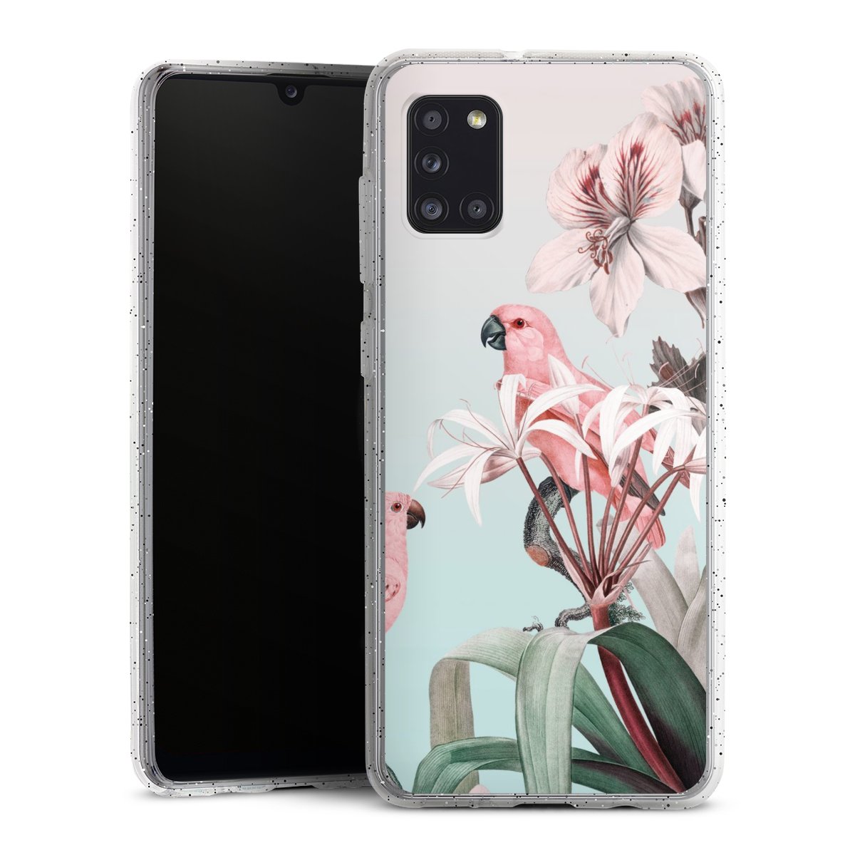 Die flexible Silikonhülle besteht aus robustem TPU (thermoplastisches Polyurethan) mit eingearbeiteten Glitzerpartikeln. Durch das langlebige, bruchsichere Material ist die Hülle biegsam und formbeständig zugleich. Die funkelnde Variante unter unseren Handyhüllen liegt griffig in der Hand und ist in Transparent mit silbernem Glitzer erhältlich.