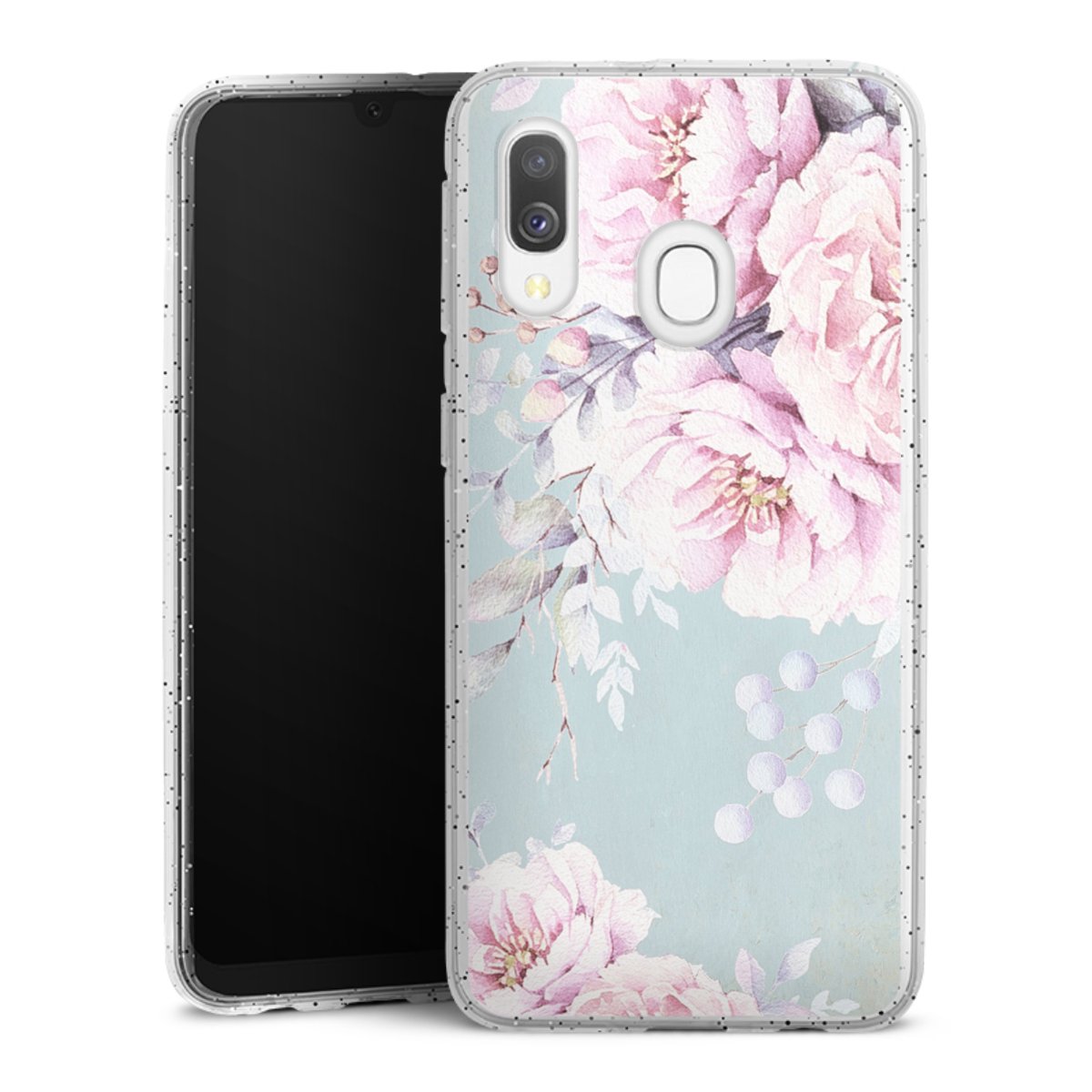 Die flexible Silikonhülle besteht aus robustem TPU (thermoplastisches Polyurethan) mit eingearbeiteten Glitzerpartikeln. Durch das langlebige, bruchsichere Material ist die Hülle biegsam und formbeständig zugleich. Die funkelnde Variante unter unseren Handyhüllen liegt griffig in der Hand und ist in Transparent mit silbernem Glitzer erhältlich.