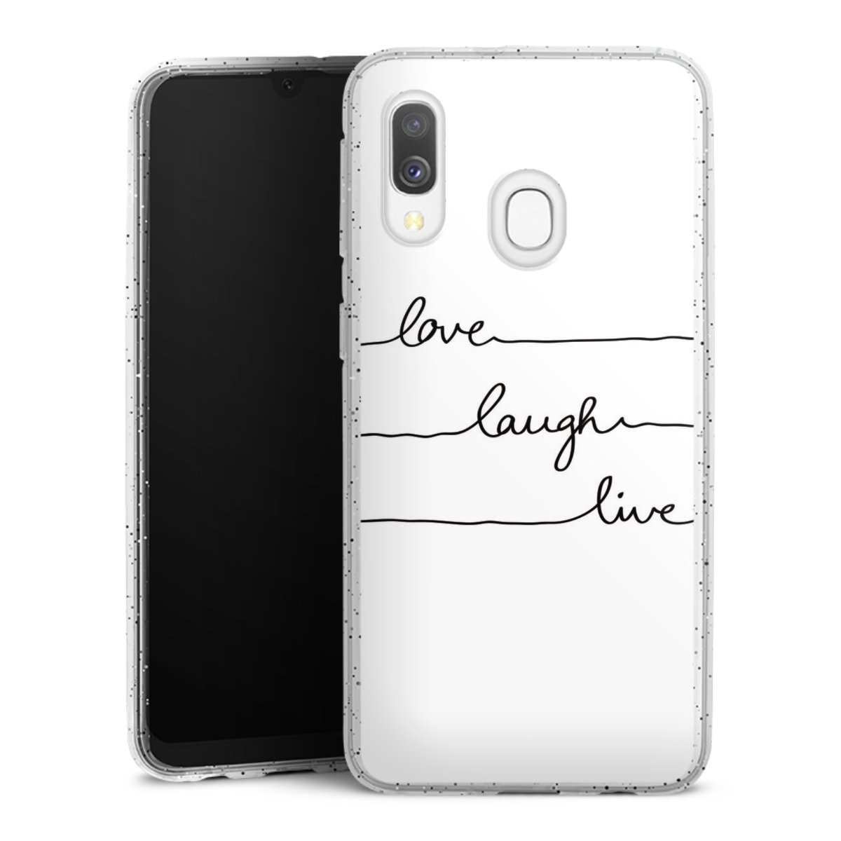 Die flexible Silikonhülle besteht aus robustem TPU (thermoplastisches Polyurethan) mit eingearbeiteten Glitzerpartikeln. Durch das langlebige, bruchsichere Material ist die Hülle biegsam und formbeständig zugleich. Die funkelnde Variante unter unseren Handyhüllen liegt griffig in der Hand und ist in Transparent mit silbernem Glitzer erhältlich.
