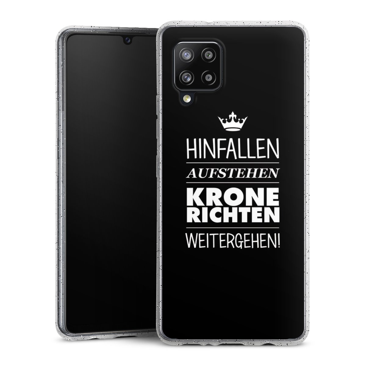 Die flexible Silikonhülle besteht aus robustem TPU (thermoplastisches Polyurethan) mit eingearbeiteten Glitzerpartikeln. Durch das langlebige, bruchsichere Material ist die Hülle biegsam und formbeständig zugleich. Die funkelnde Variante unter unseren Handyhüllen liegt griffig in der Hand und ist in Transparent mit silbernem Glitzer erhältlich.
