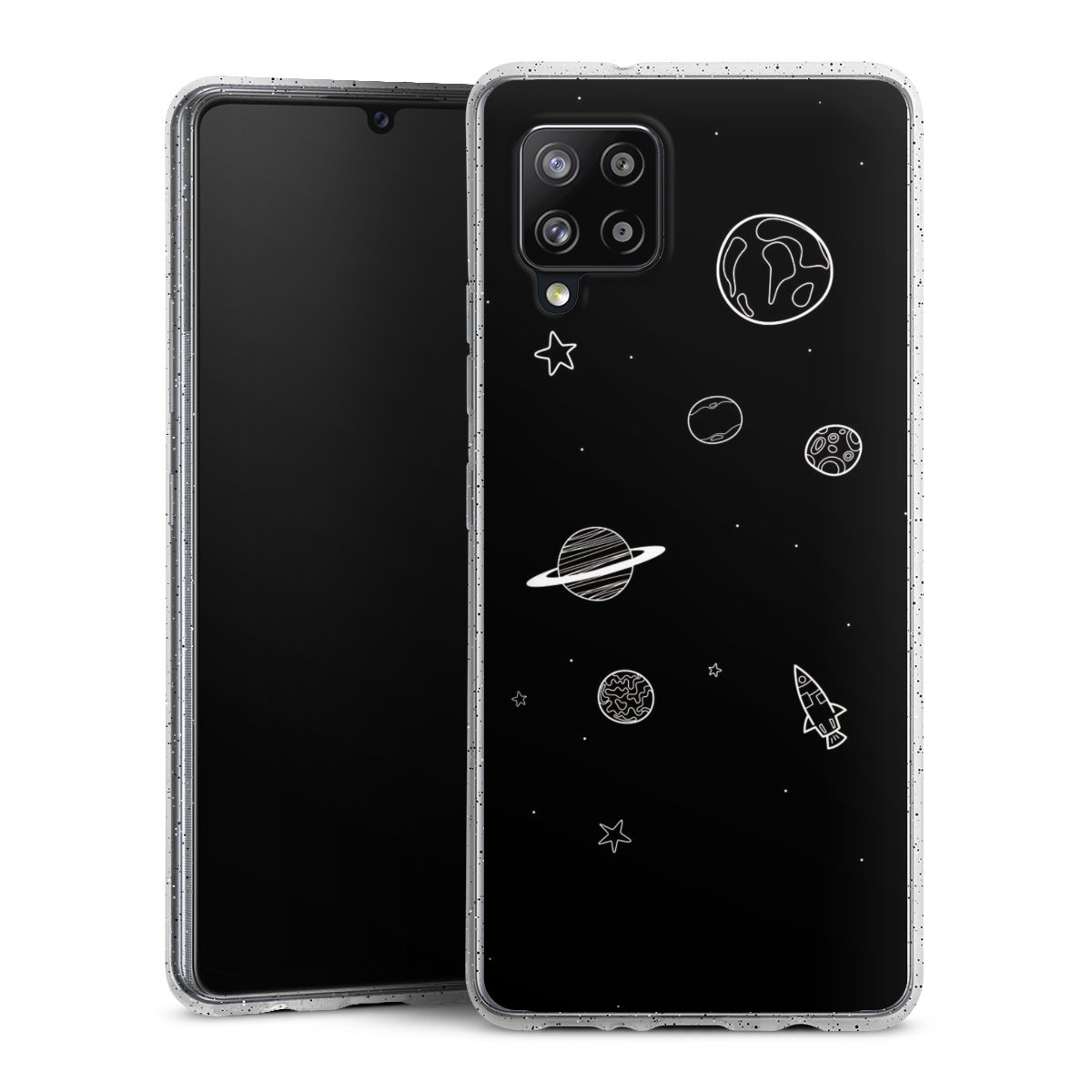 Die flexible Silikonhülle besteht aus robustem TPU (thermoplastisches Polyurethan) mit eingearbeiteten Glitzerpartikeln. Durch das langlebige, bruchsichere Material ist die Hülle biegsam und formbeständig zugleich. Die funkelnde Variante unter unseren Handyhüllen liegt griffig in der Hand und ist in Transparent mit silbernem Glitzer erhältlich.