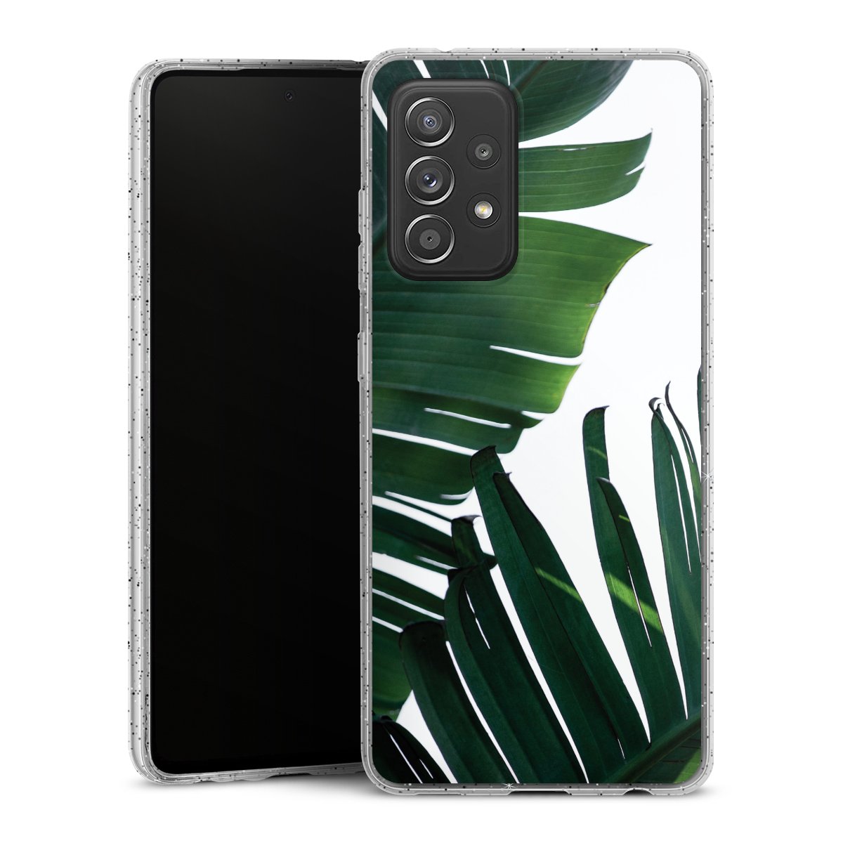 Die flexible Silikonhülle besteht aus robustem TPU (thermoplastisches Polyurethan) mit eingearbeiteten Glitzerpartikeln. Durch das langlebige, bruchsichere Material ist die Hülle biegsam und formbeständig zugleich. Die funkelnde Variante unter unseren Handyhüllen liegt griffig in der Hand und ist in Transparent mit silbernem Glitzer erhältlich.