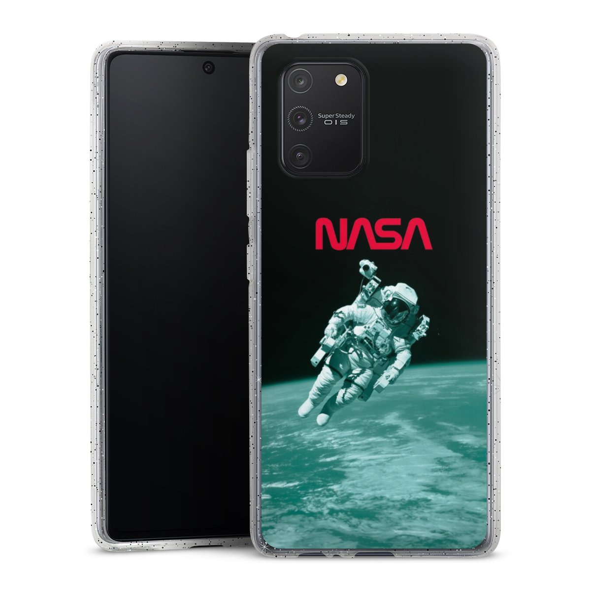 Die flexible Silikonhülle besteht aus robustem TPU (thermoplastisches Polyurethan) mit eingearbeiteten Glitzerpartikeln. Durch das langlebige, bruchsichere Material ist die Hülle biegsam und formbeständig zugleich. Die funkelnde Variante unter unseren Handyhüllen liegt griffig in der Hand und ist in Transparent mit silbernem Glitzer erhältlich.