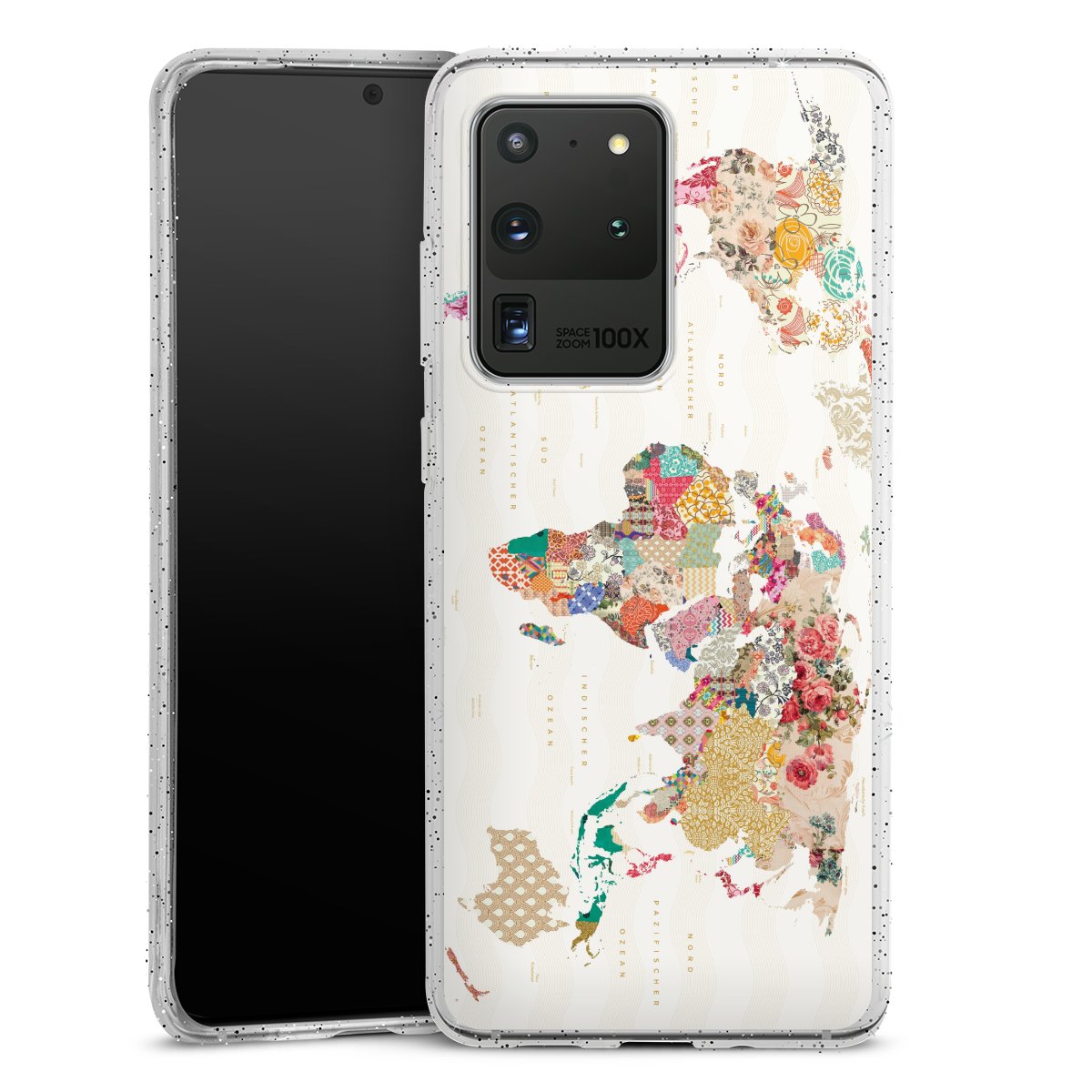 Die flexible Silikonhülle besteht aus robustem TPU (thermoplastisches Polyurethan) mit eingearbeiteten Glitzerpartikeln. Durch das langlebige, bruchsichere Material ist die Hülle biegsam und formbeständig zugleich. Die funkelnde Variante unter unseren Handyhüllen liegt griffig in der Hand und ist in Transparent mit silbernem Glitzer erhältlich.