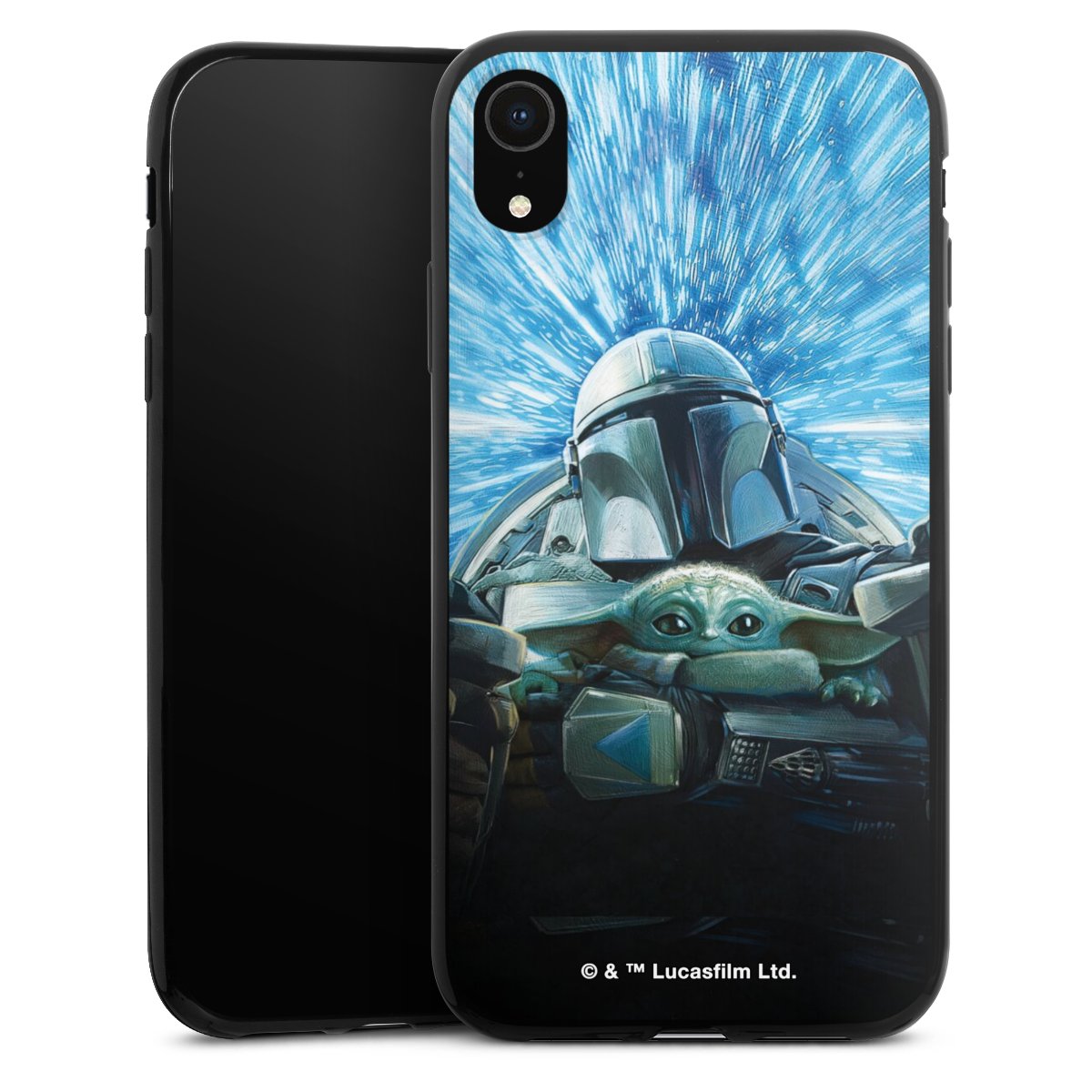 Grogu und Mando fliegen blau