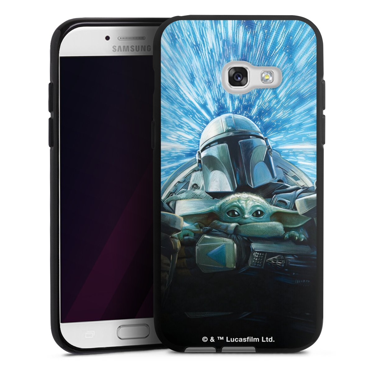 Grogu und Mando fliegen blau