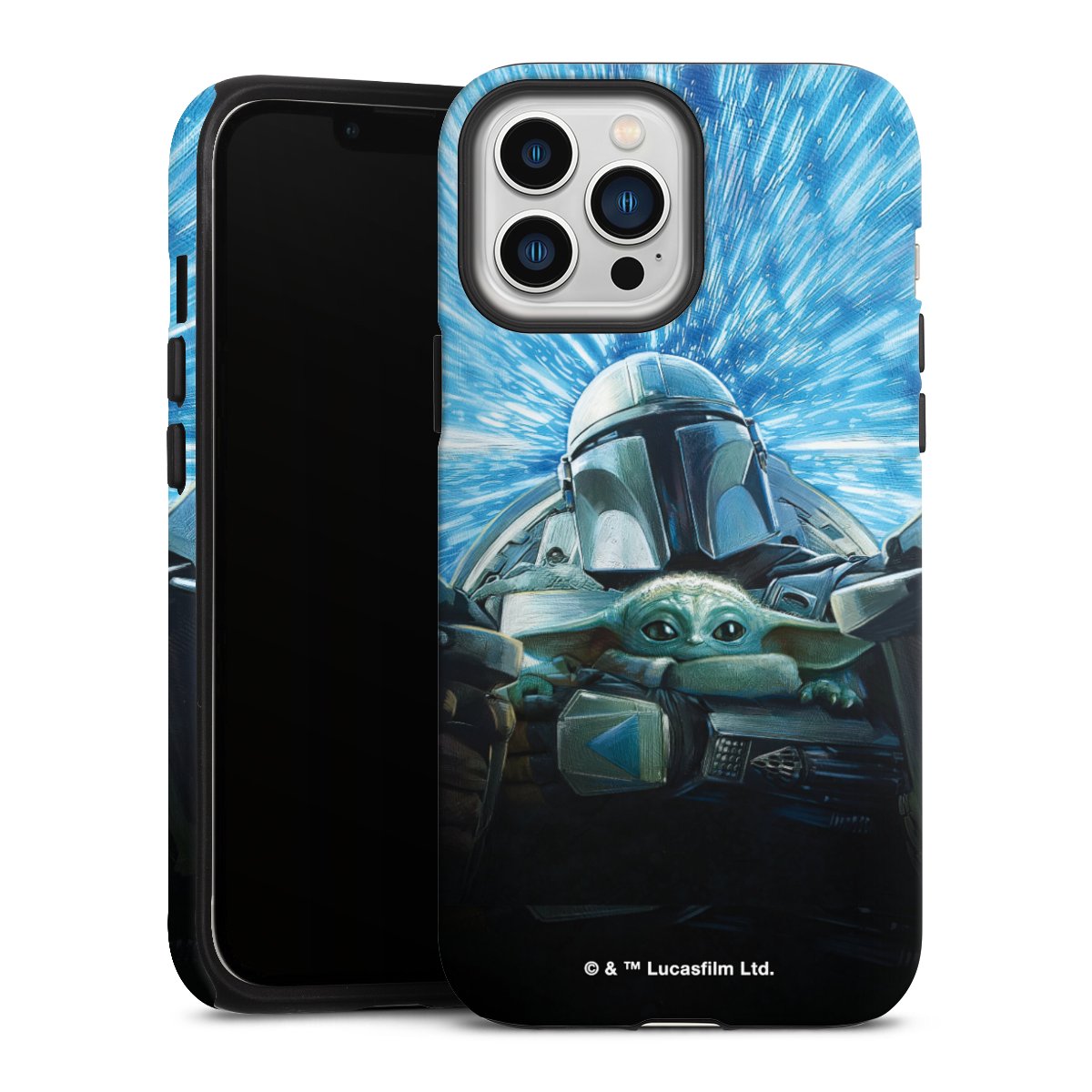 Grogu und Mando fliegen blau